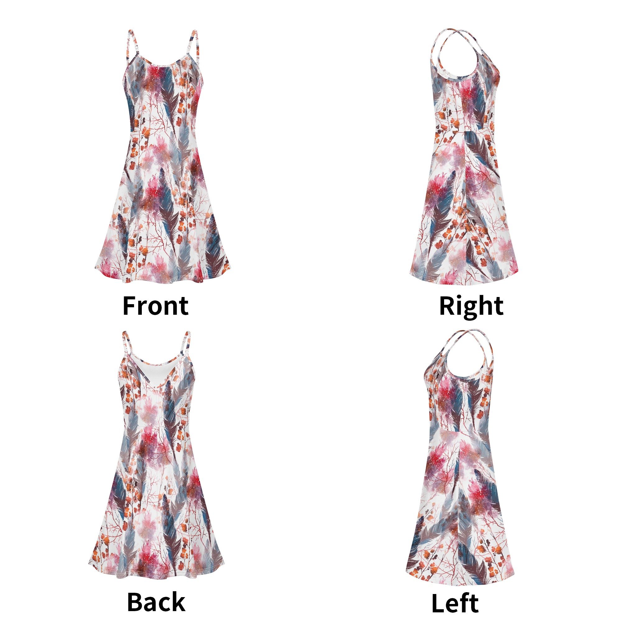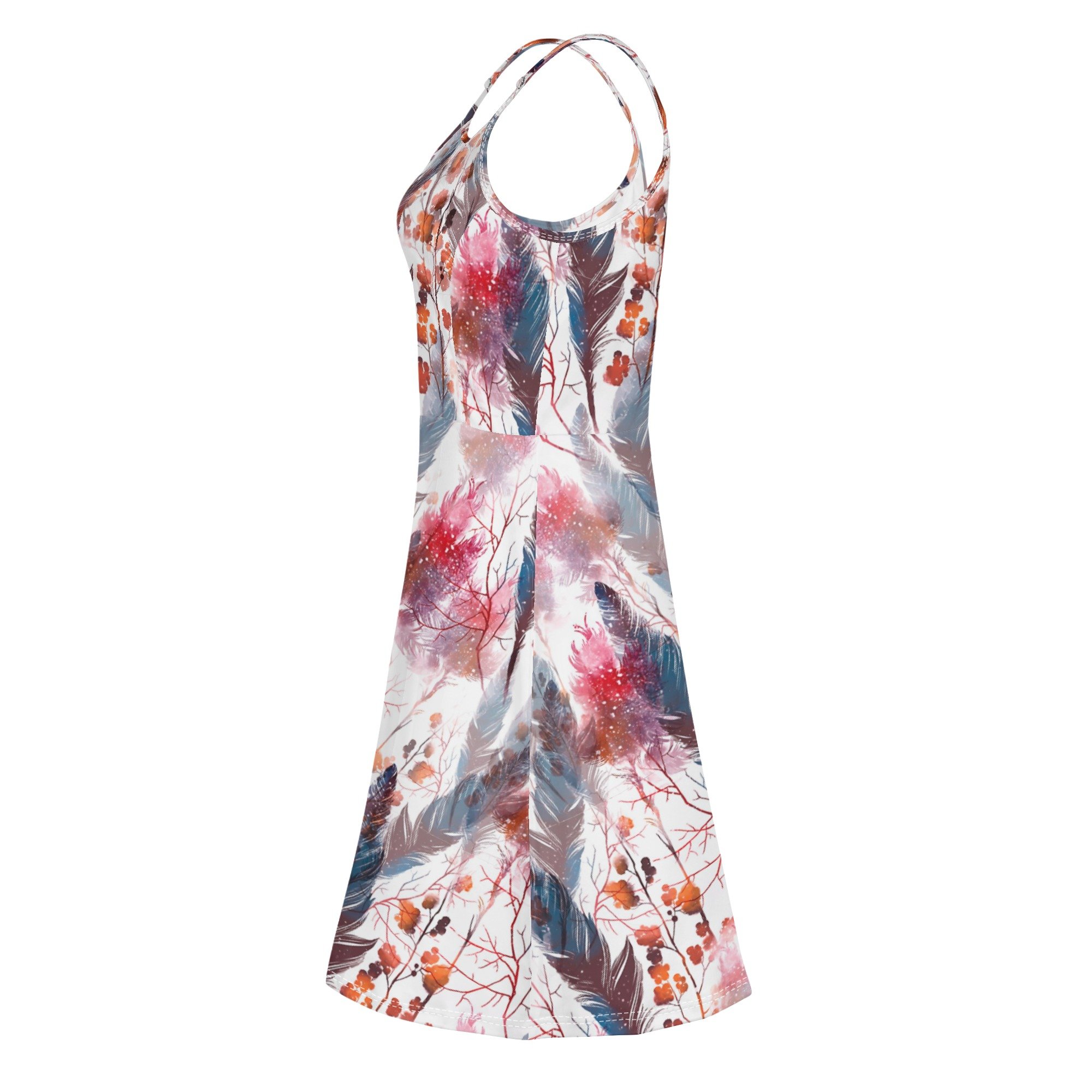 La magia de este vestido está en su impresionante estampado de plumas y elementos naturales. Las plumas en tonos azulados y rojizos contrastan con ramas marrones y naranjas sobre un fondo blanco, logrando una combinación armónica y llamativa. Este diseño no solo está lleno de vida, sino que también transmite un aire de libertad y frescura, ideal para los días soleados.