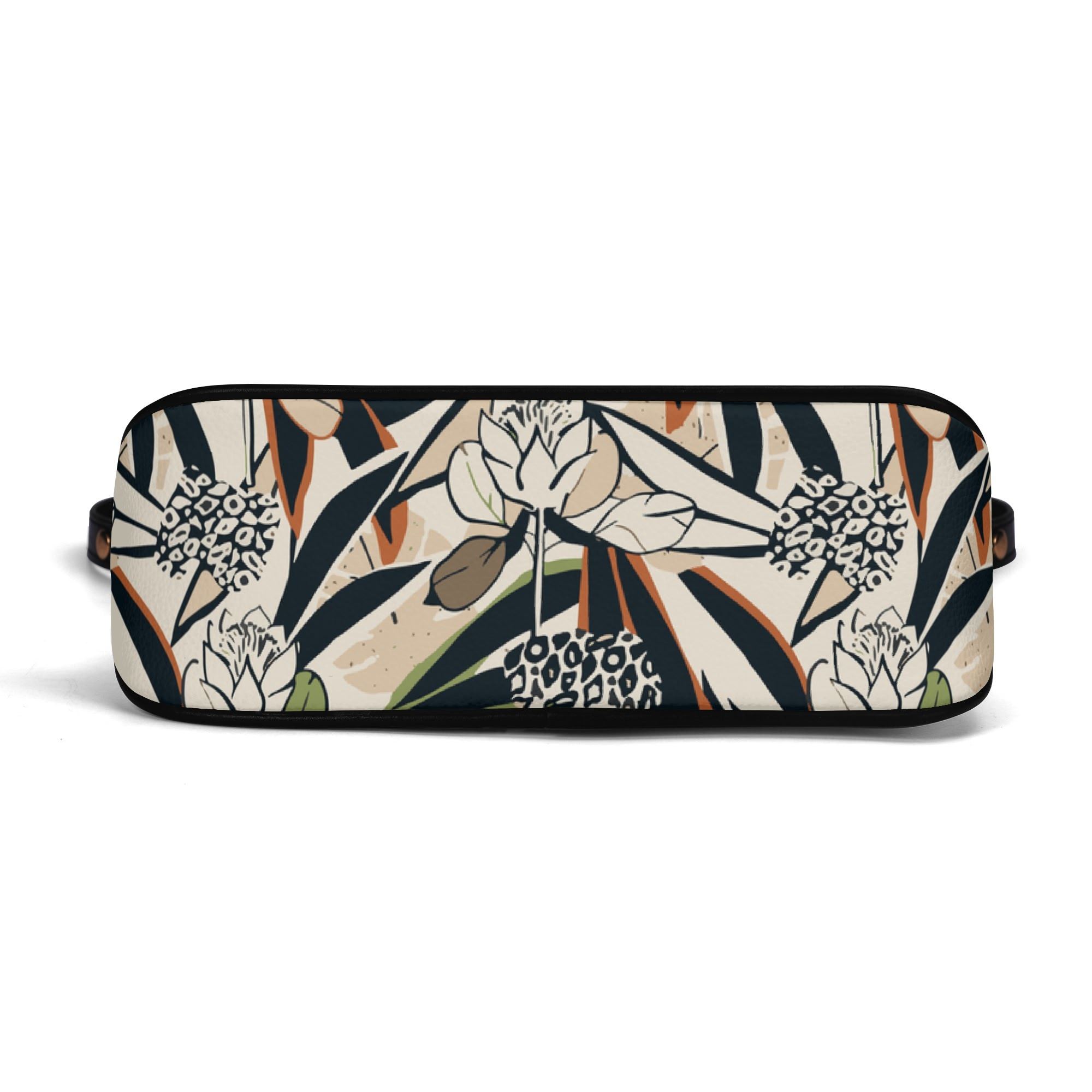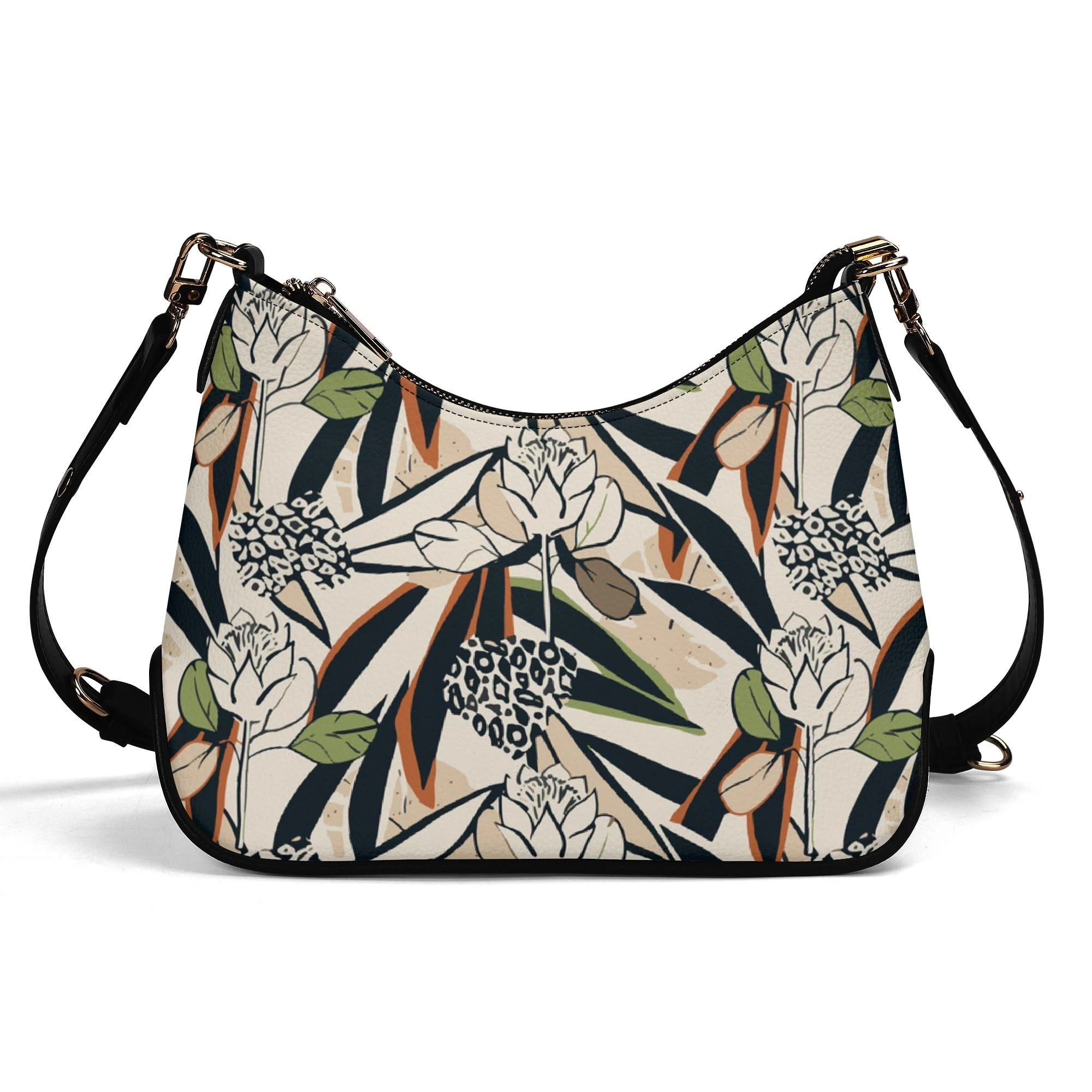 Este bolso destaca por su patrón floral estilizado, una interpretación artística de elementos botánicos que le da un aire moderno y sofisticado. Las flores abstractas, junto con hojas y ramas de líneas definidas, crean un diseño único que atraerá todas las miradas.