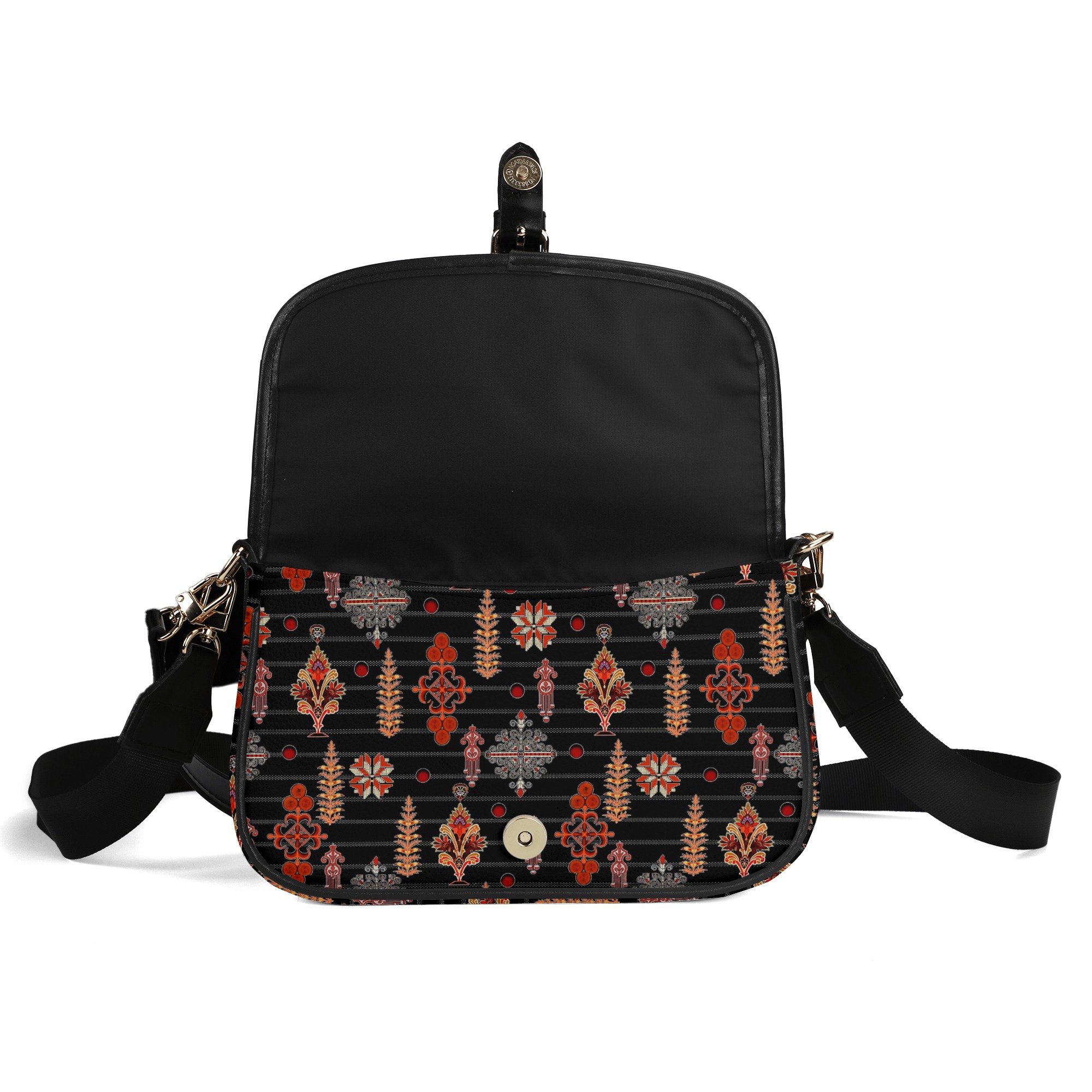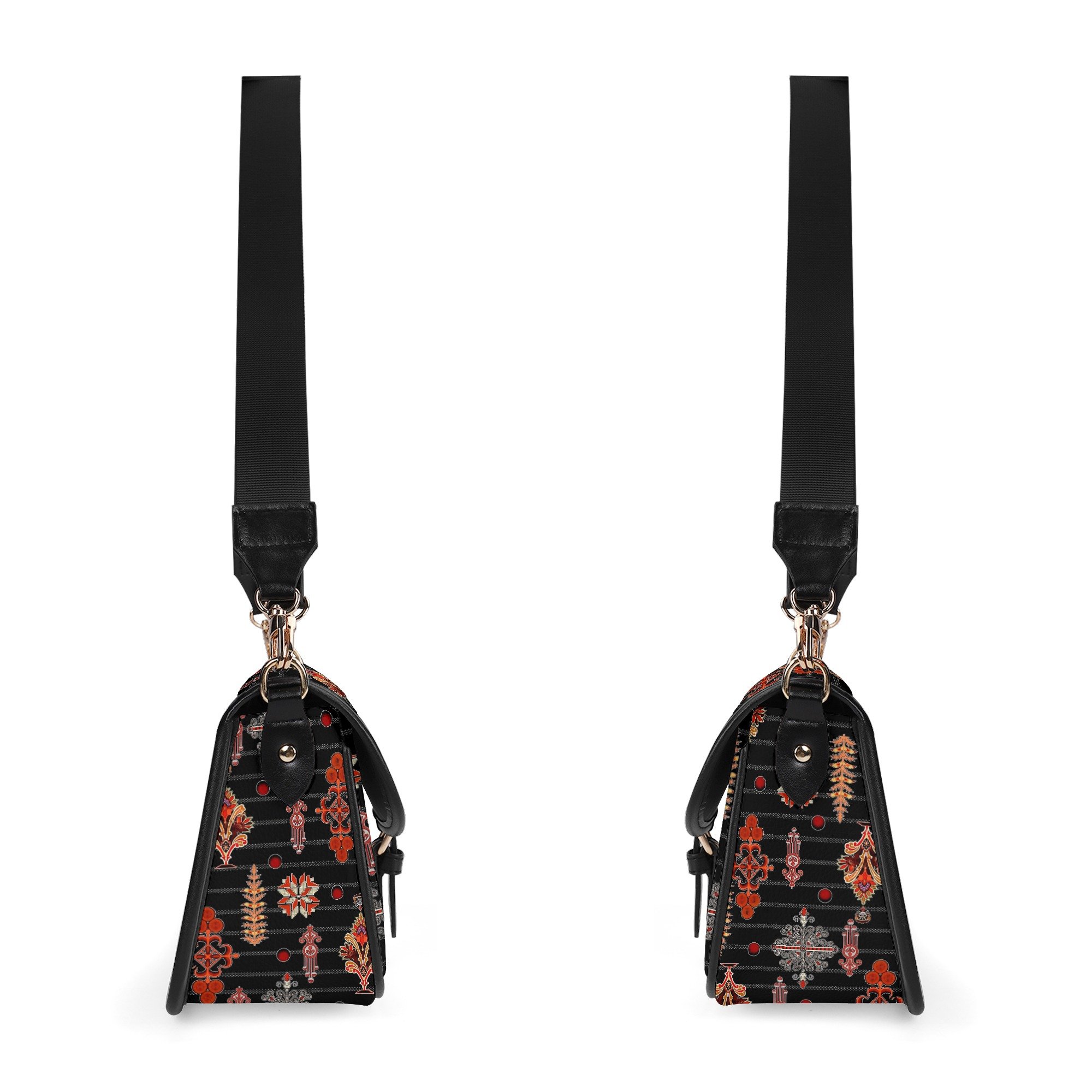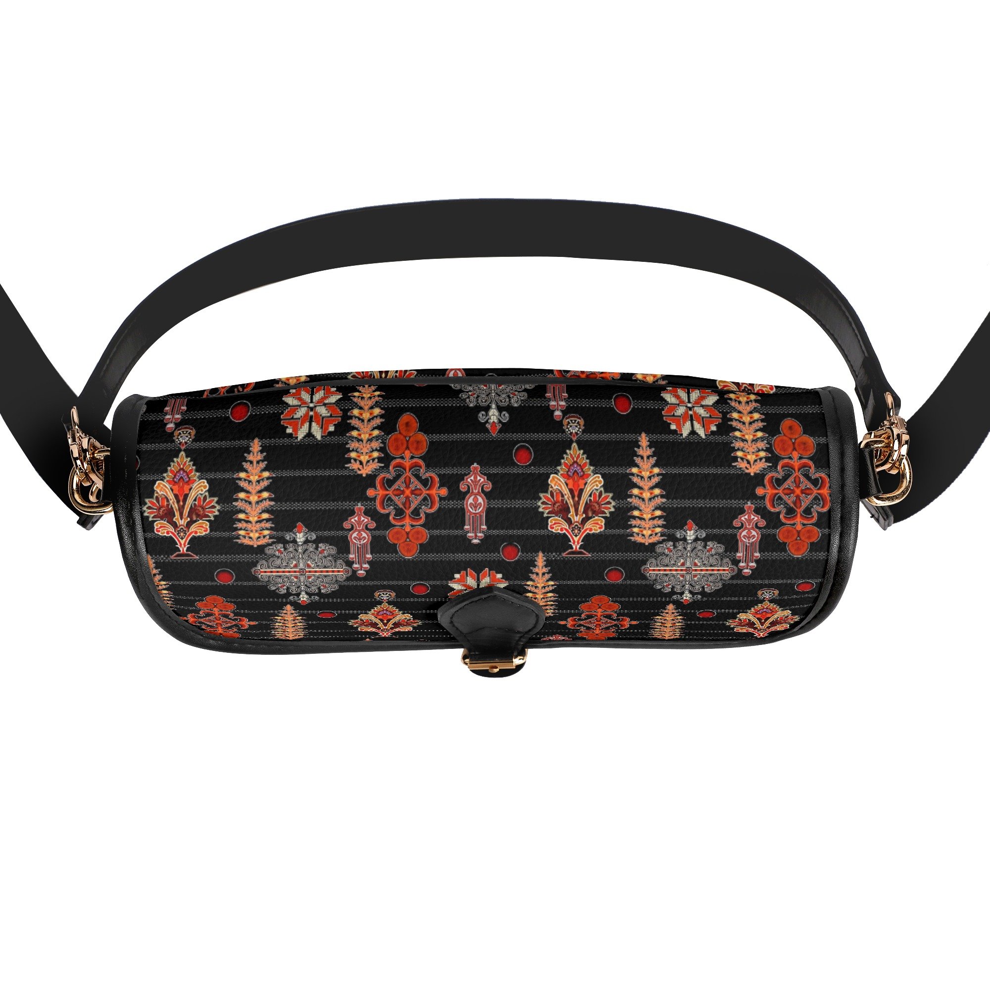 La estética de este bolso no pasa desapercibida. Su estampado ornamental fusiona motivos florales y geométricos estilizados, logrando una armonía visual que evoca tradiciones artesanales con un toque moderno. Los colores cálidos como el rojo, naranja, marrón y beige contrastan perfectamente con el fondo negro, creando una pieza vibrante y sofisticada.