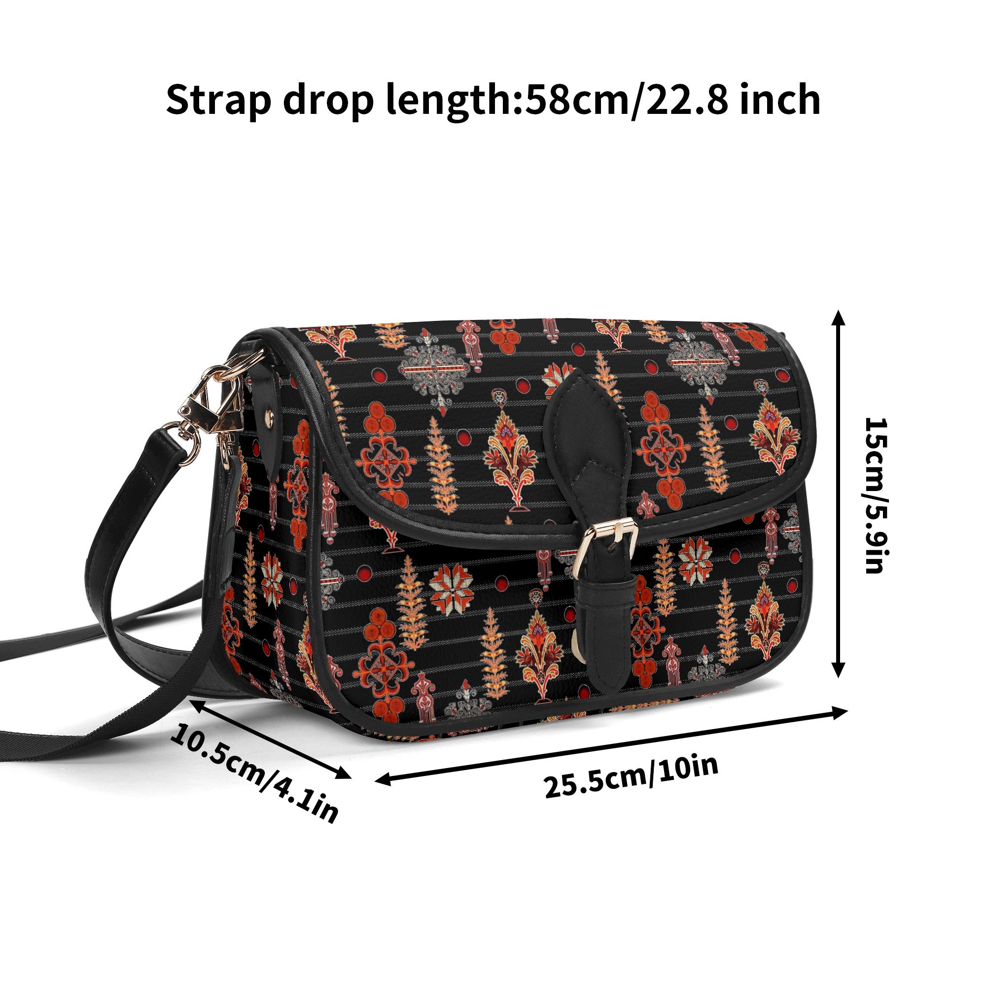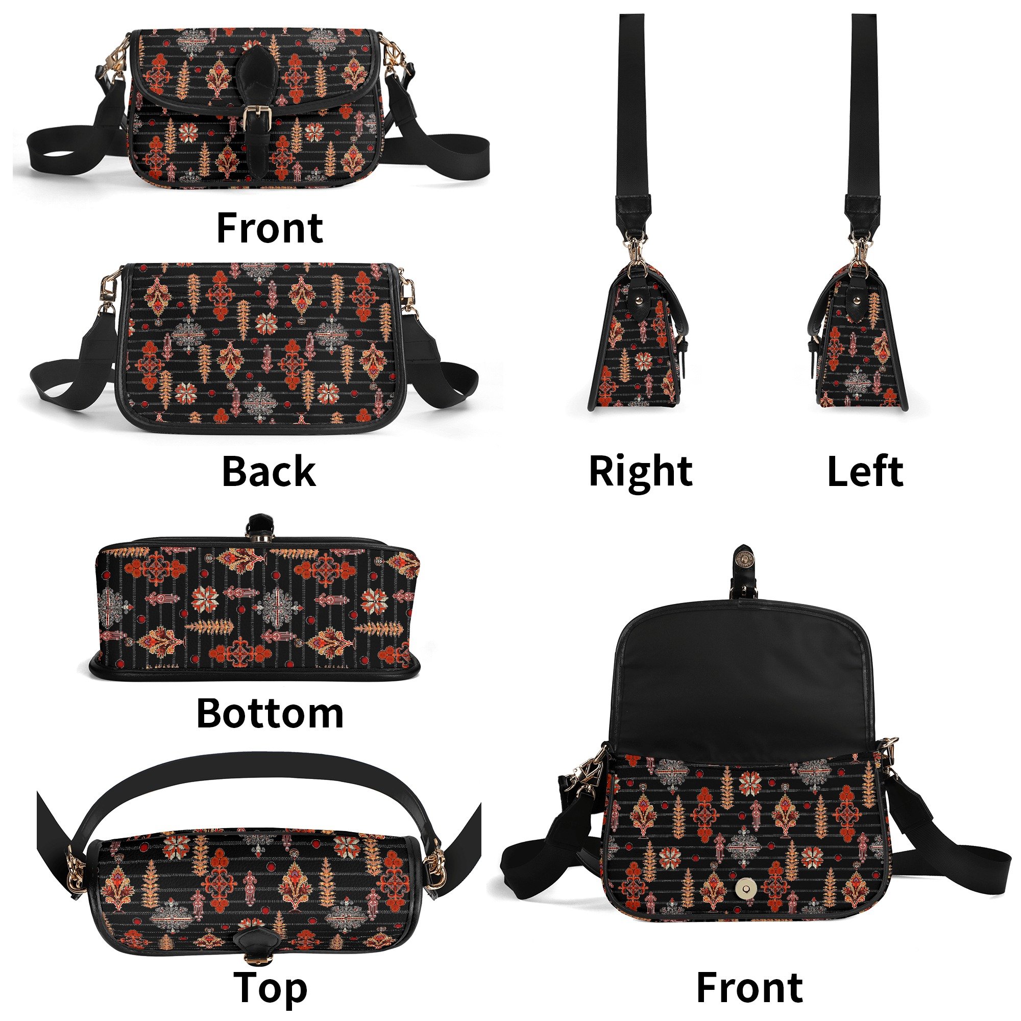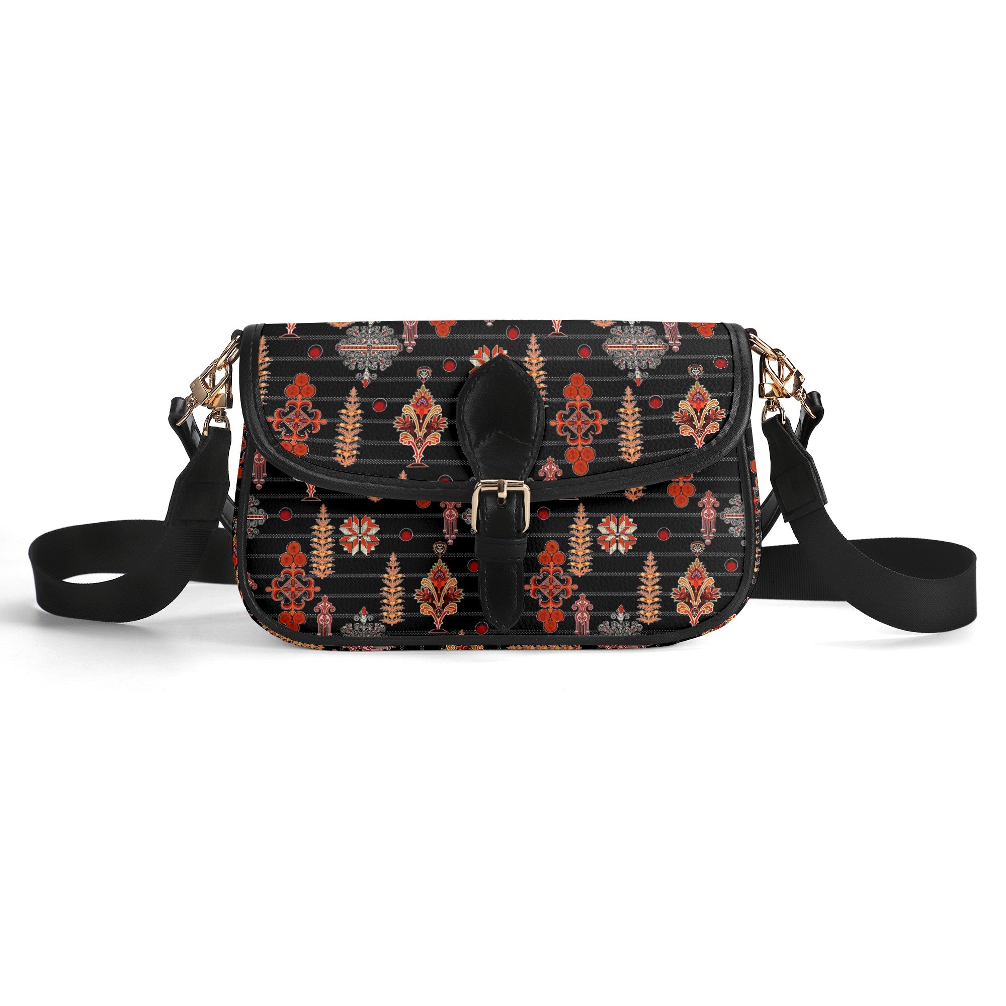 La estética de este bolso no pasa desapercibida. Su estampado ornamental fusiona motivos florales y geométricos estilizados, logrando una armonía visual que evoca tradiciones artesanales con un toque moderno. Los colores cálidos como el rojo, naranja, marrón y beige contrastan perfectamente con el fondo negro, creando una pieza vibrante y sofisticada.