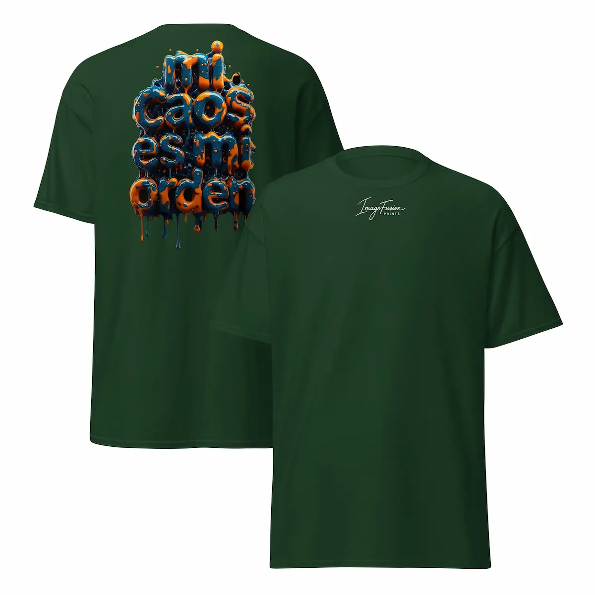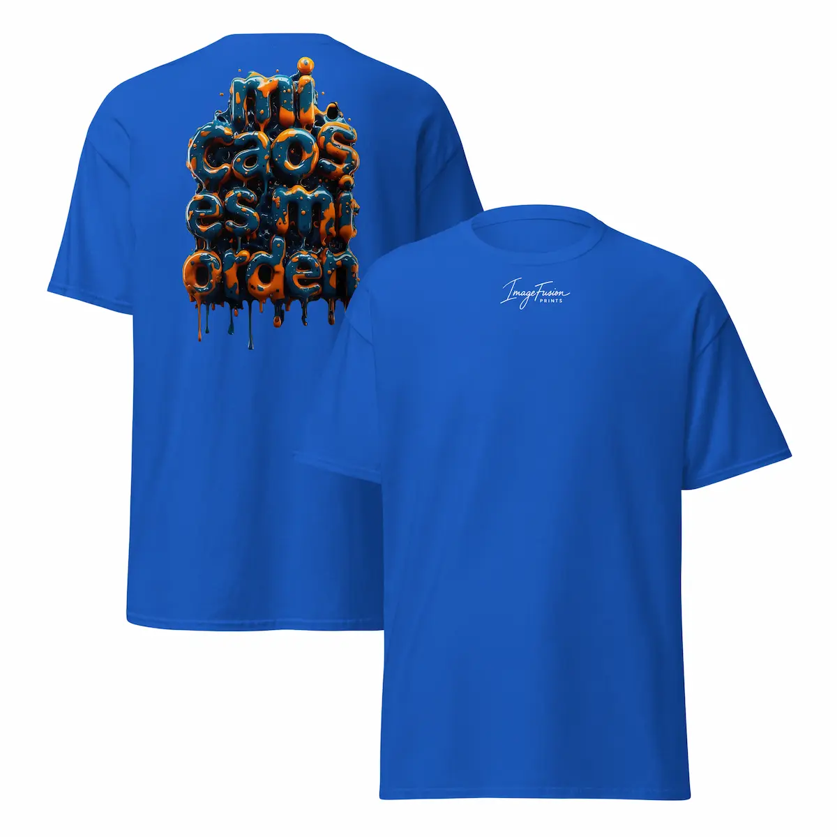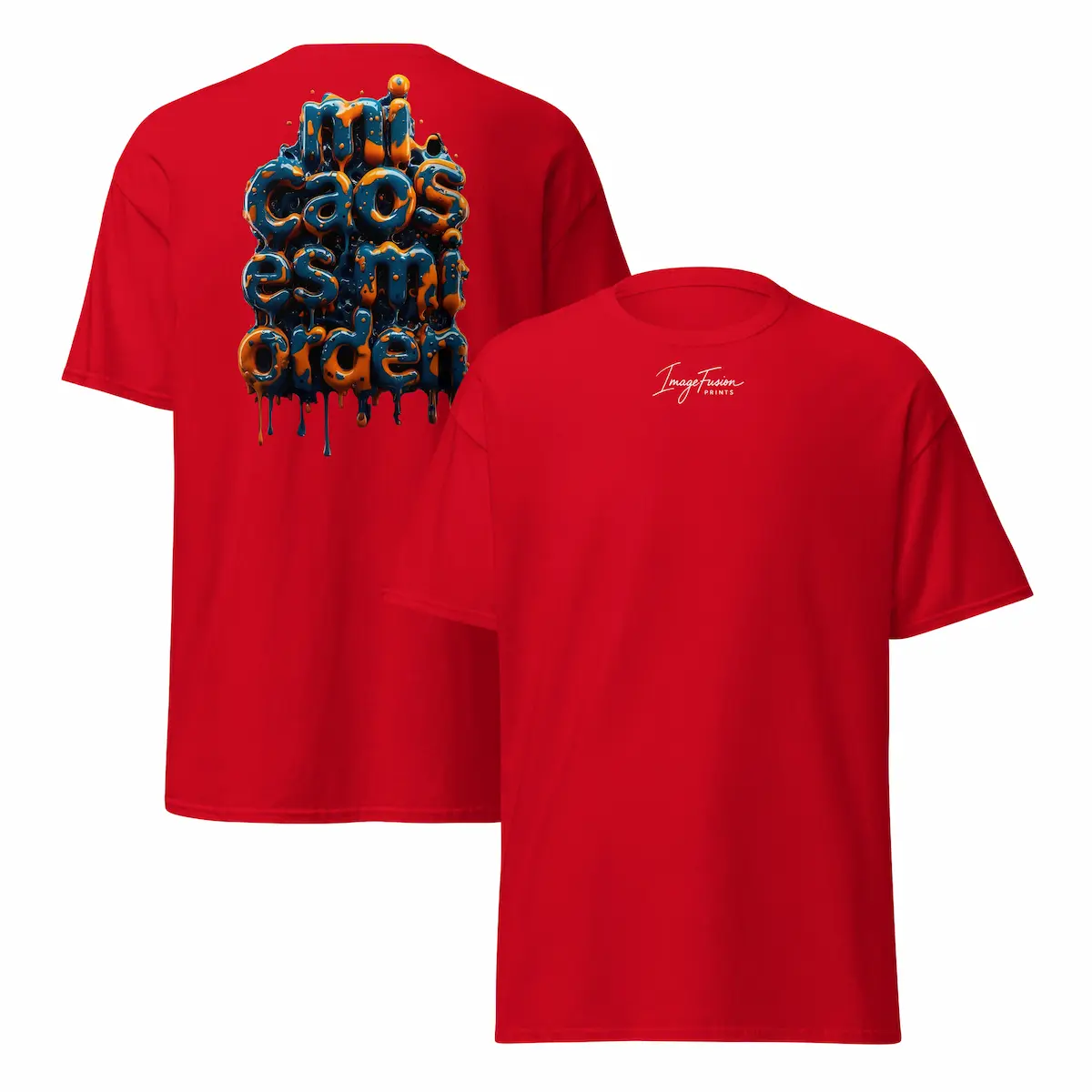 Camiseta clásica de algodón con diseño trasero “Mi Caos Es Mi Orden” y logo frontal discreto ImageFusion Prints. Corte recto, estructura premium y estilo atemporal.