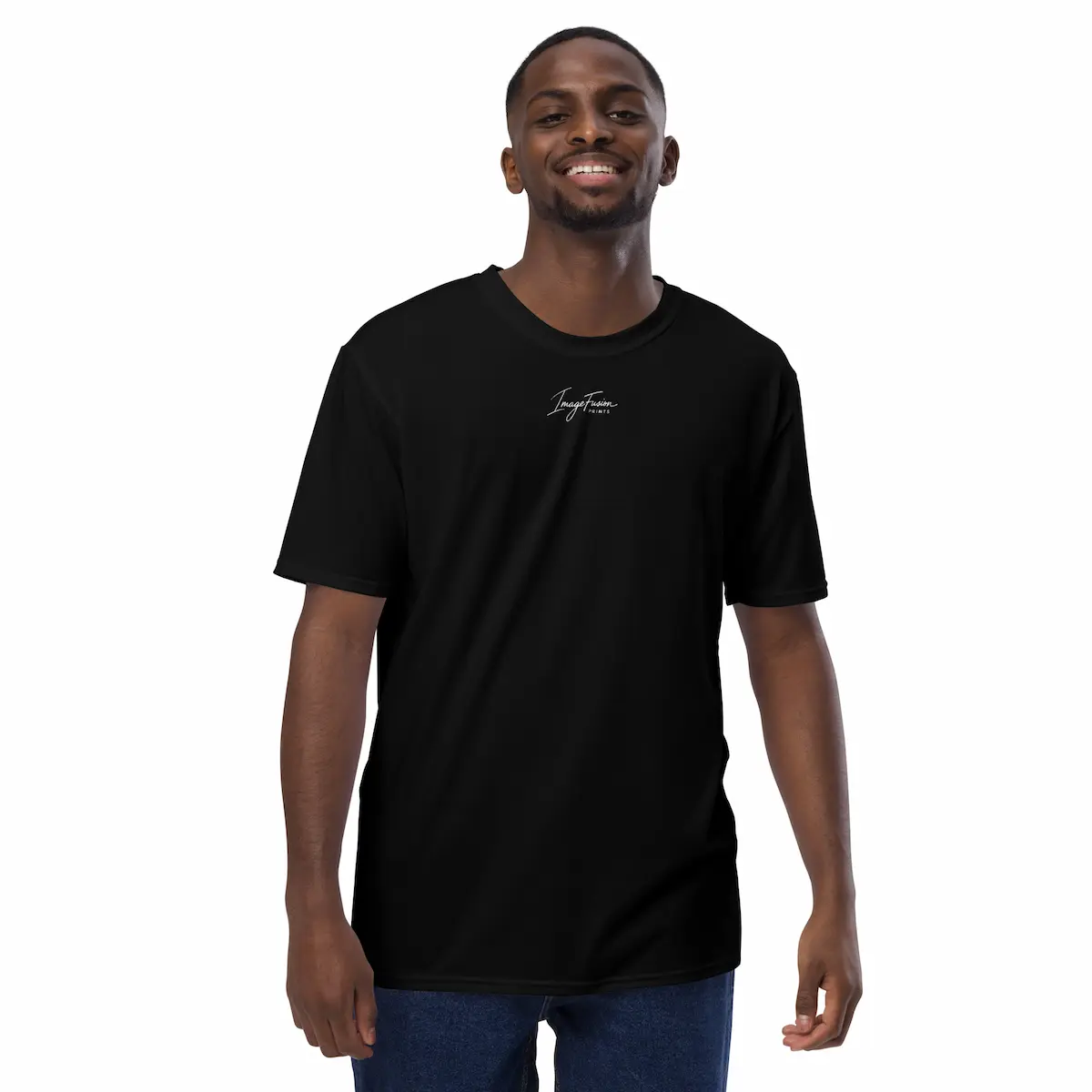 Camiseta negra para hombre con diseño trasero “Mi Caos Es Mi Orden” en estilo líquido 3D azul y naranja, y logo discreto ImageFusion Prints en el pecho.