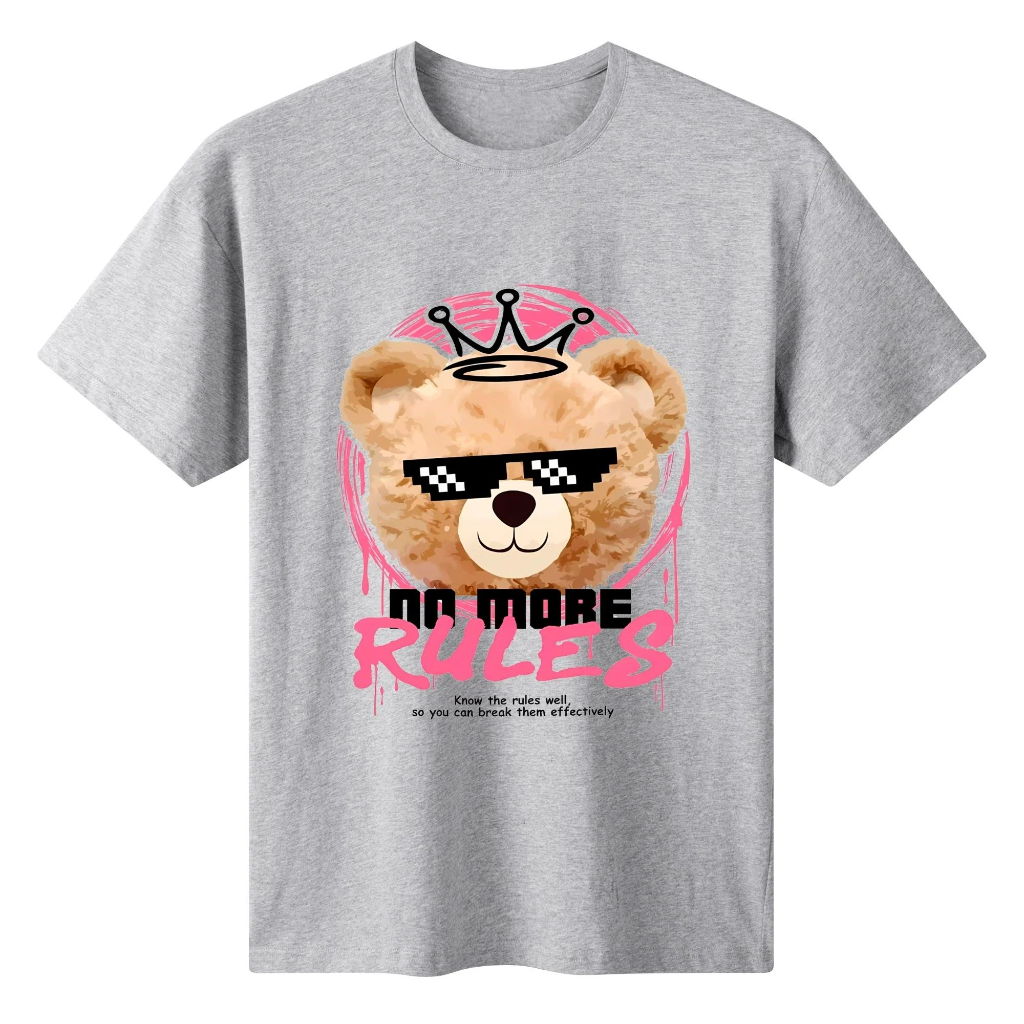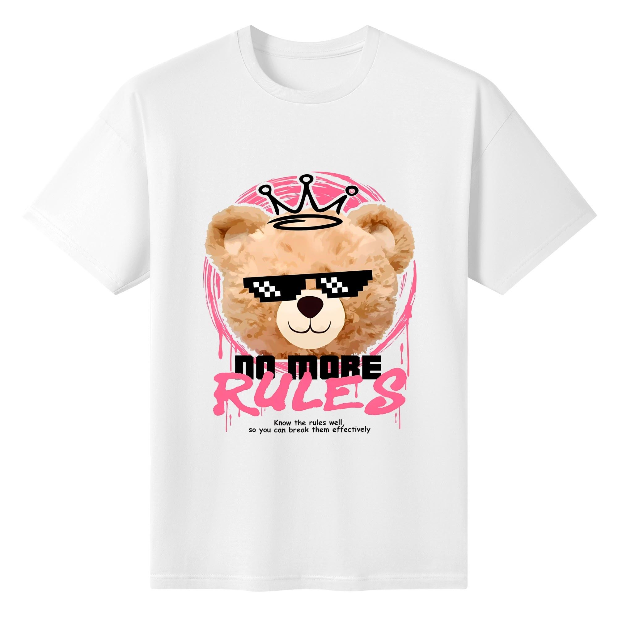 - 🐻 Estampado revolucionario: Oso de peluche con gafas de sol pixeladas, corona y el lema “NO MORE RULES”, enmarcado en tonos rosas y detalles de pinceladas dinámicas.