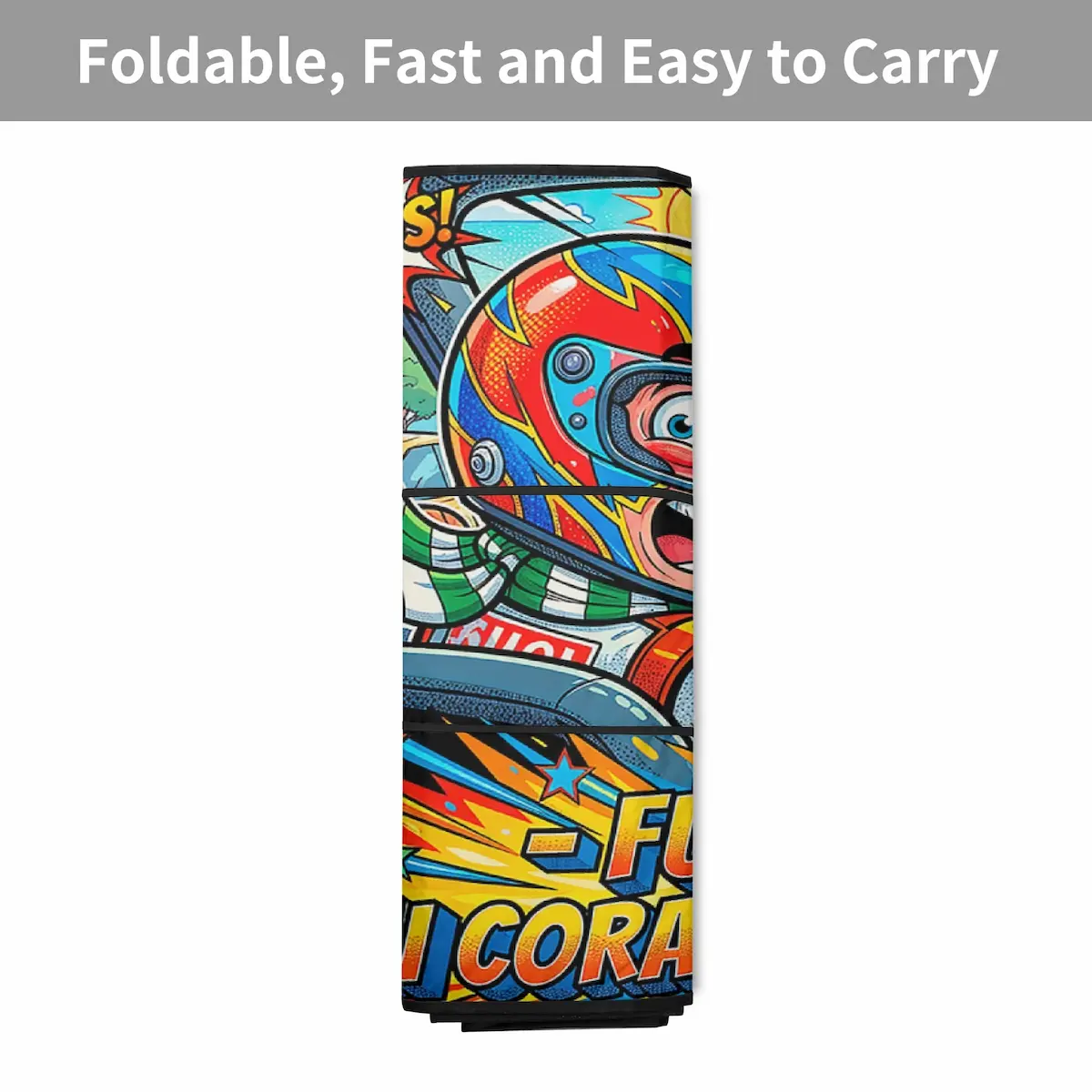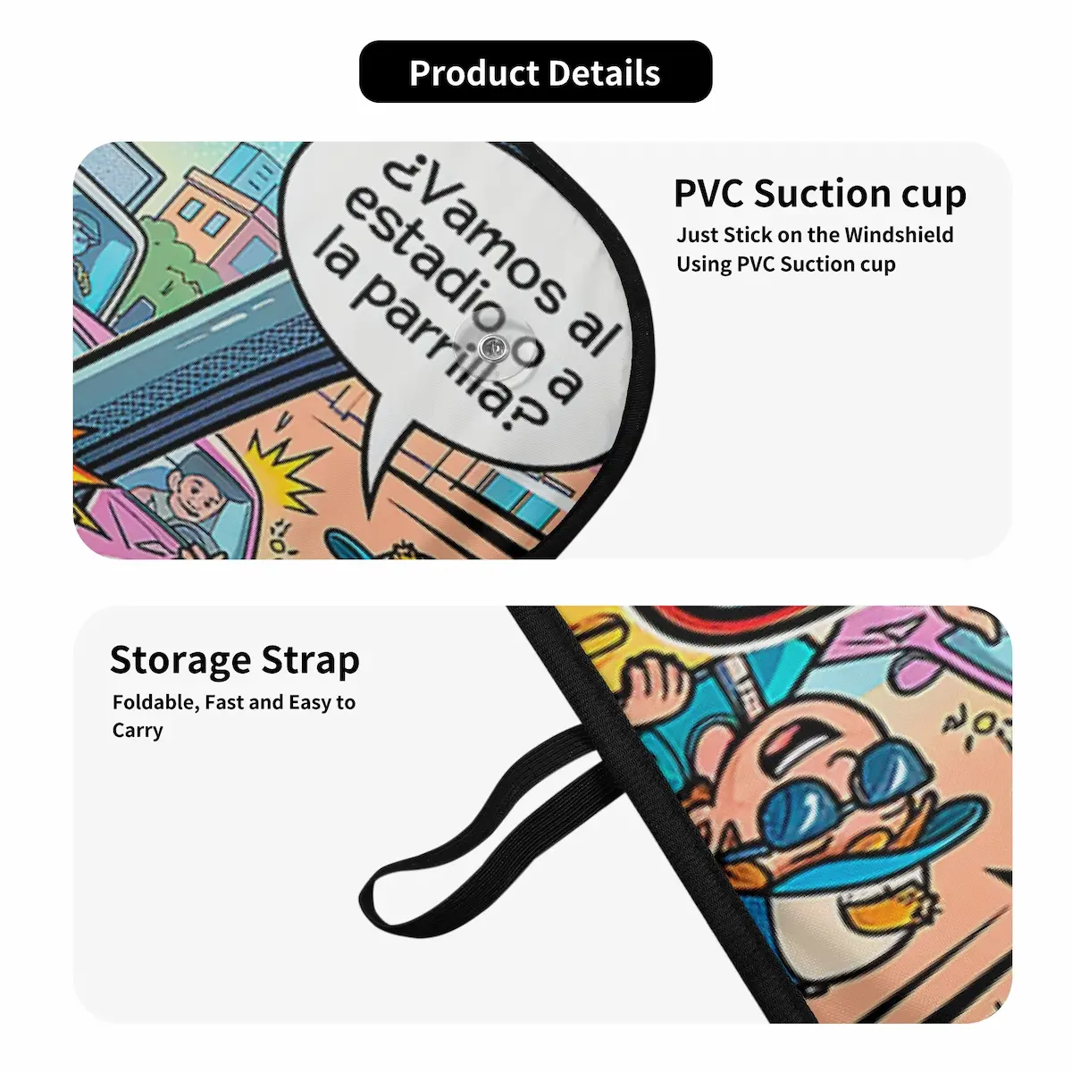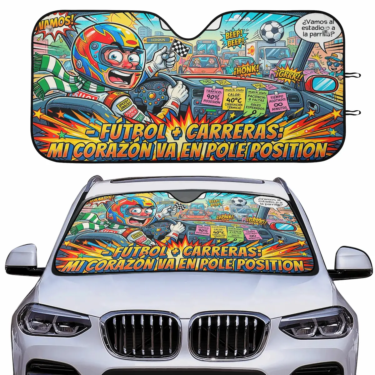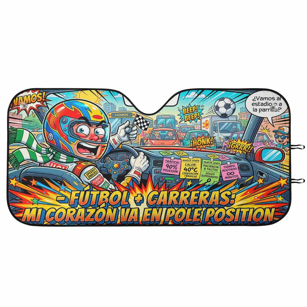 El Parasol para coche “- Fútbol + Carreras: Mi corazón va en pole position” combina la emoción del estadio y la velocidad de un circuito en una ilustración pop-art explosiva llena de color y energía.