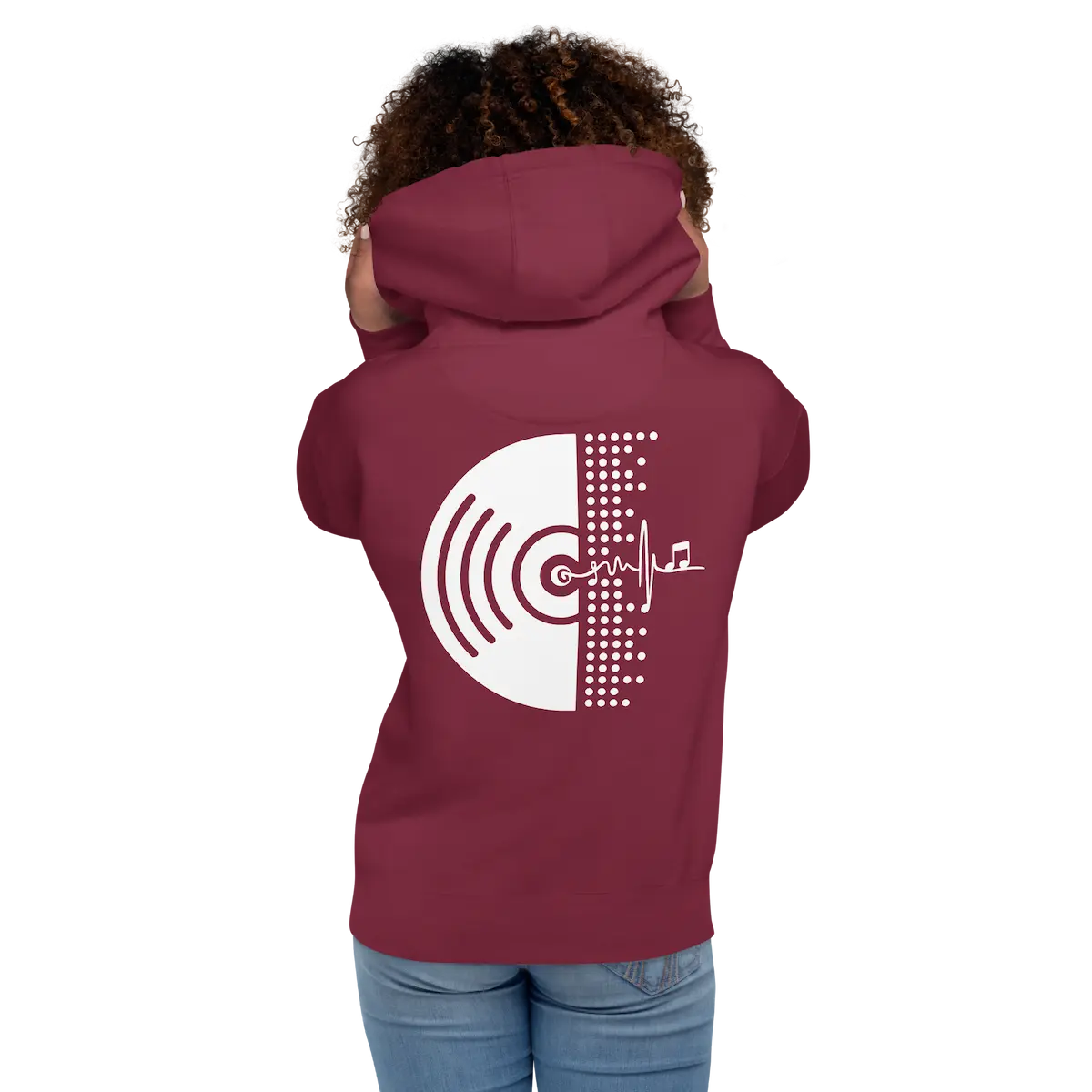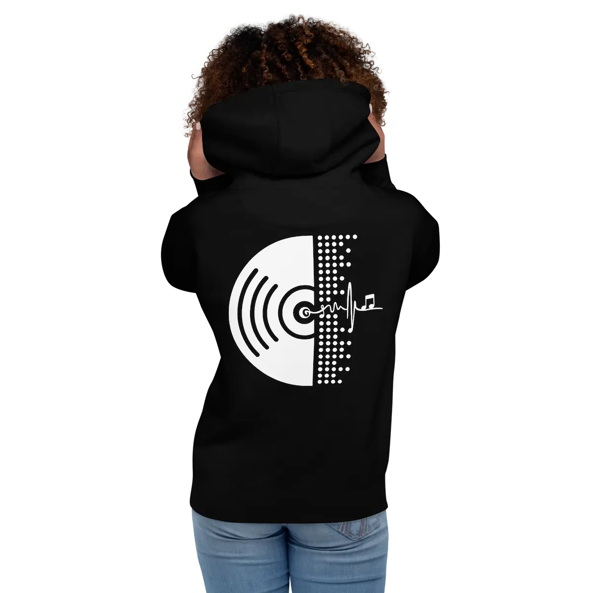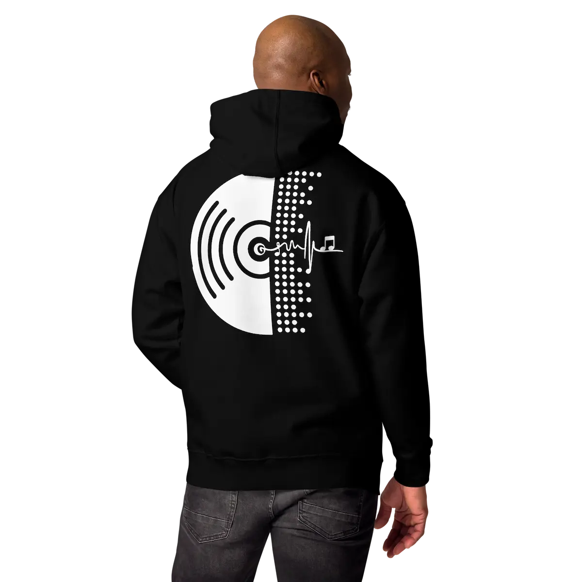 Hoodie unisex con micro-logo frontal y gráfico vinilo XL trasero. Vellón suave, capucha de 3 paneles y bolsillo canguro. Beat Vinyl – IP.