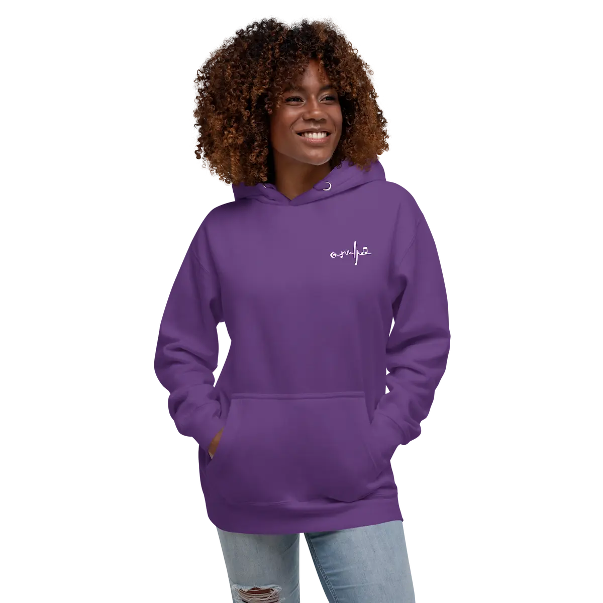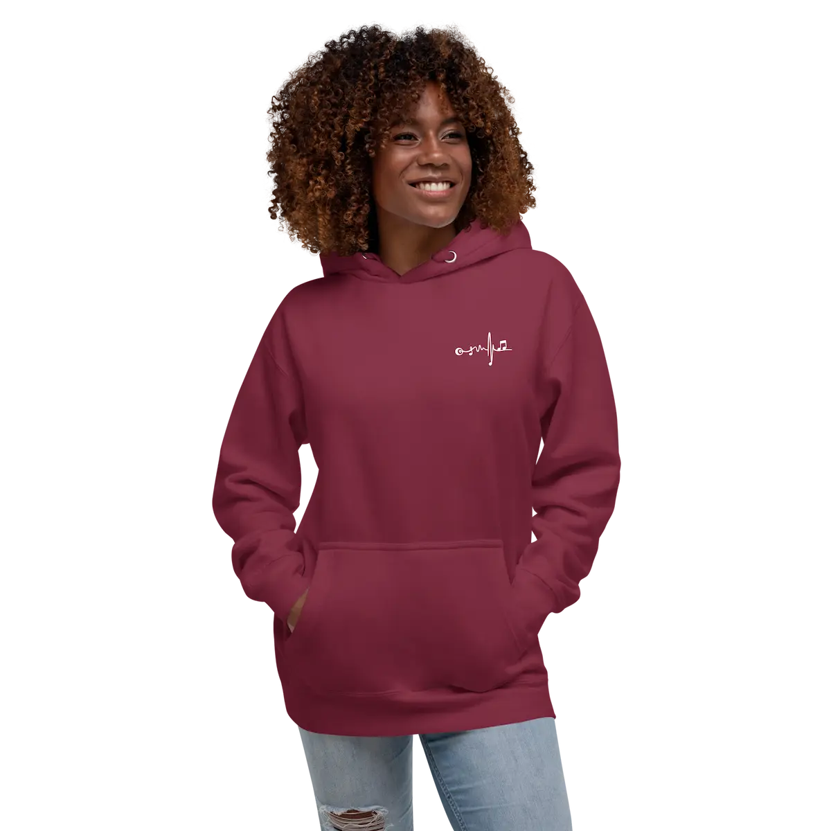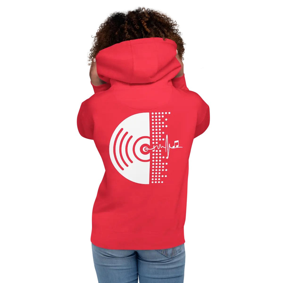 Hoodie unisex con micro-logo frontal y gráfico vinilo XL trasero. Vellón suave, capucha de 3 paneles y bolsillo canguro. Beat Vinyl – IP.