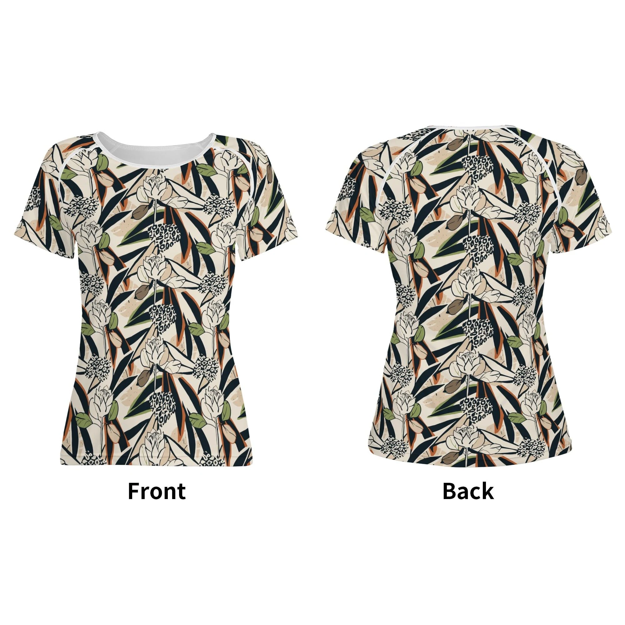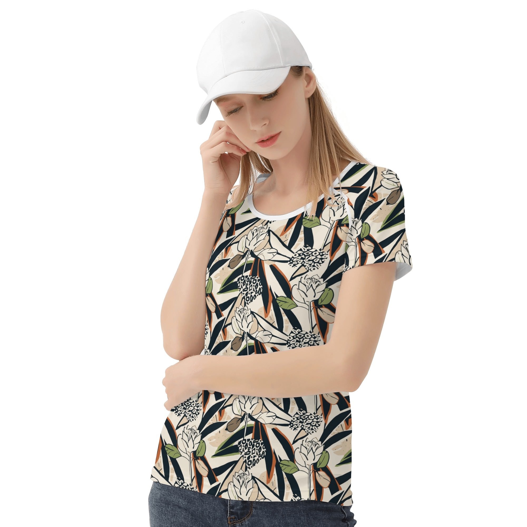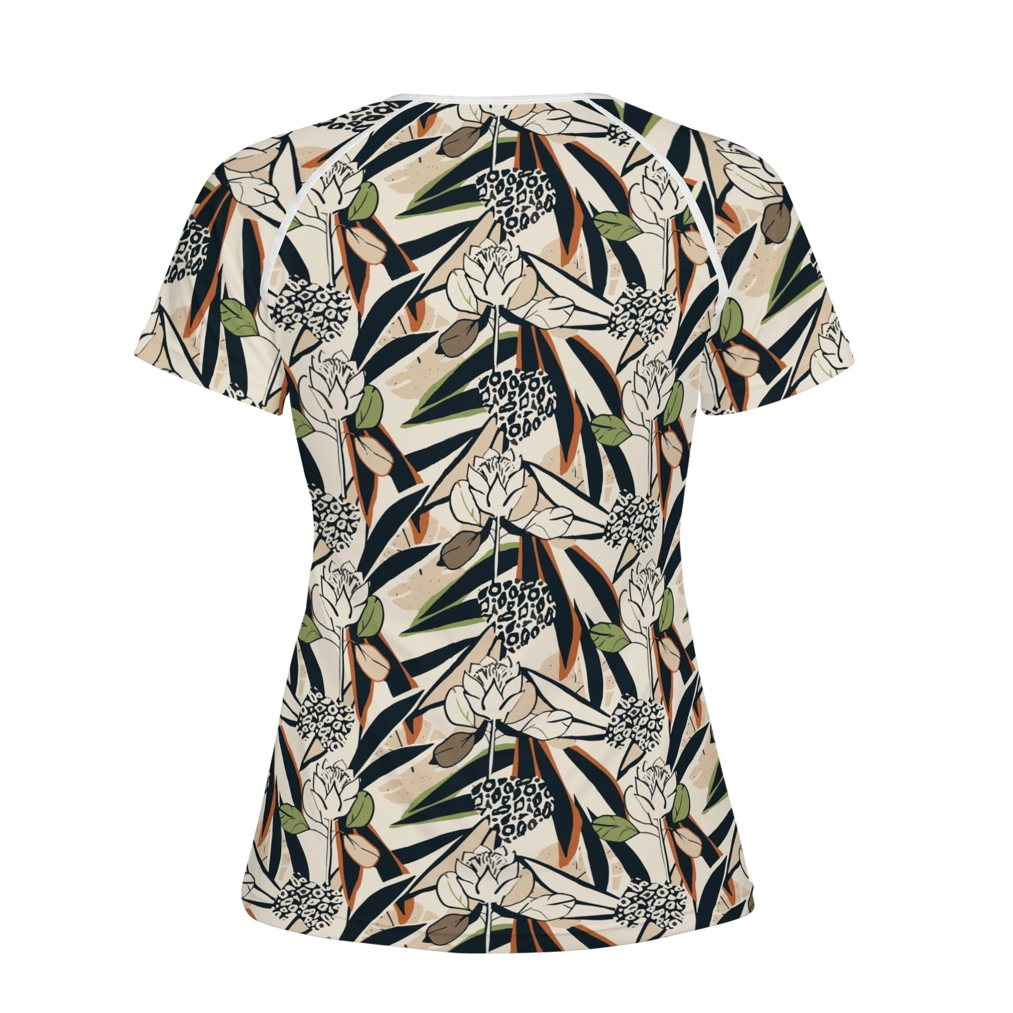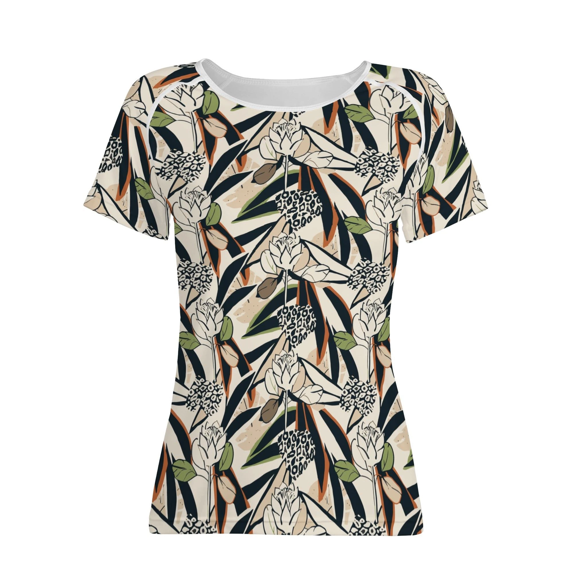 Esta camiseta no es la típica prenda con flores aburridas. No, aquí hablamos de un diseño que juega con las formas y los contrastes.