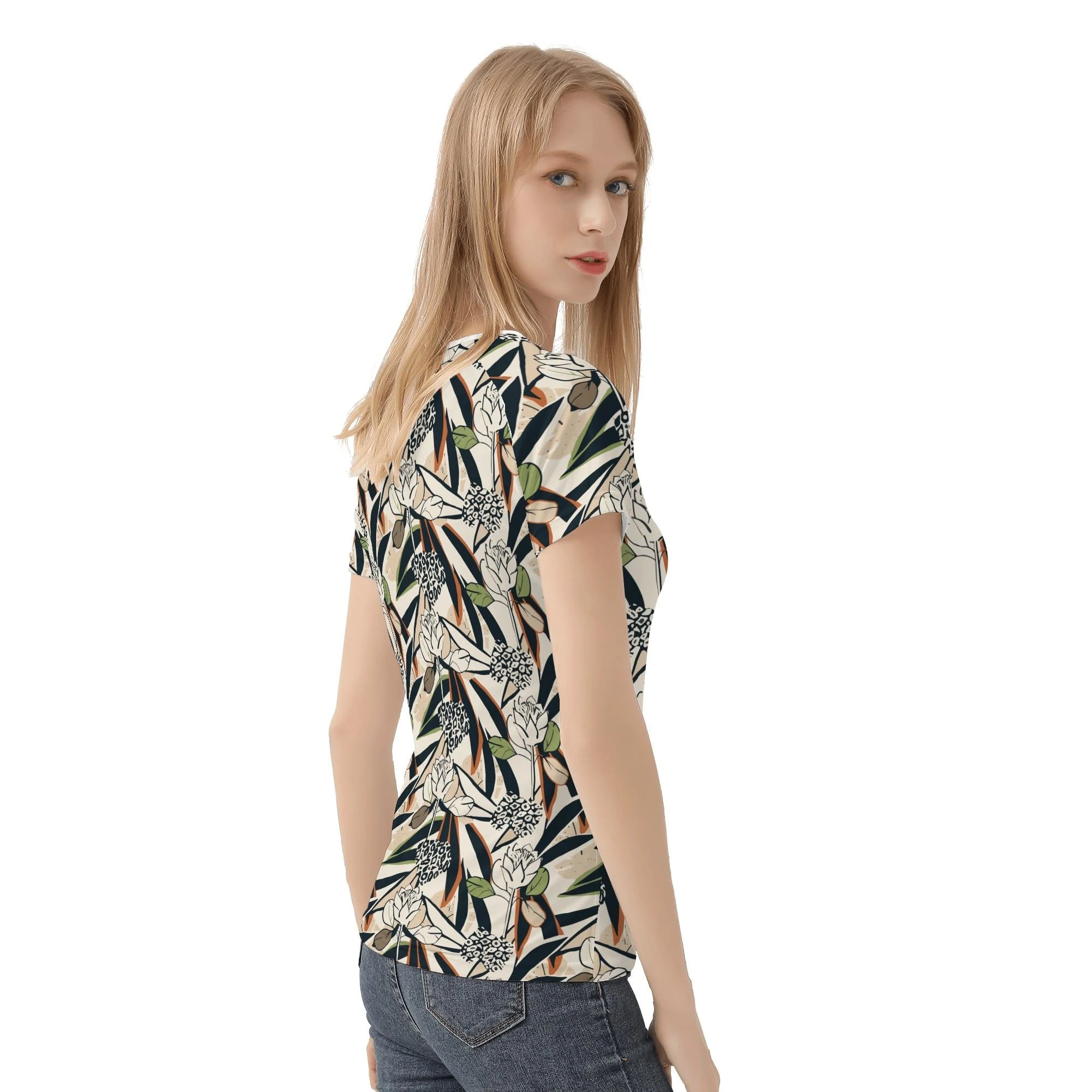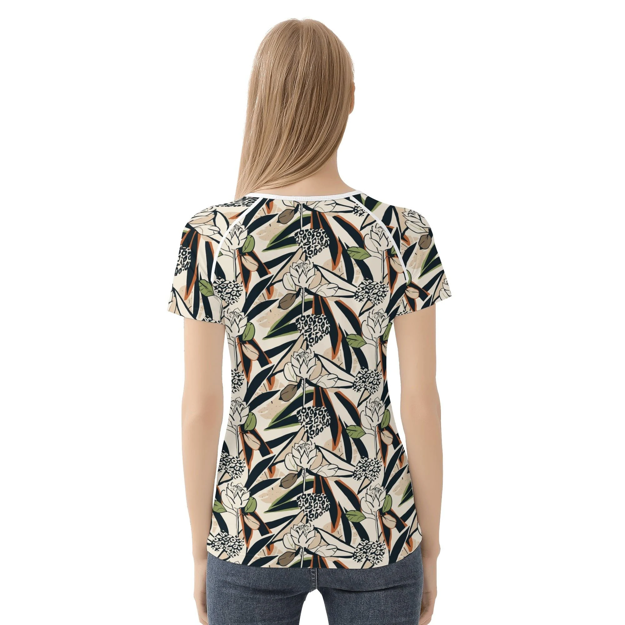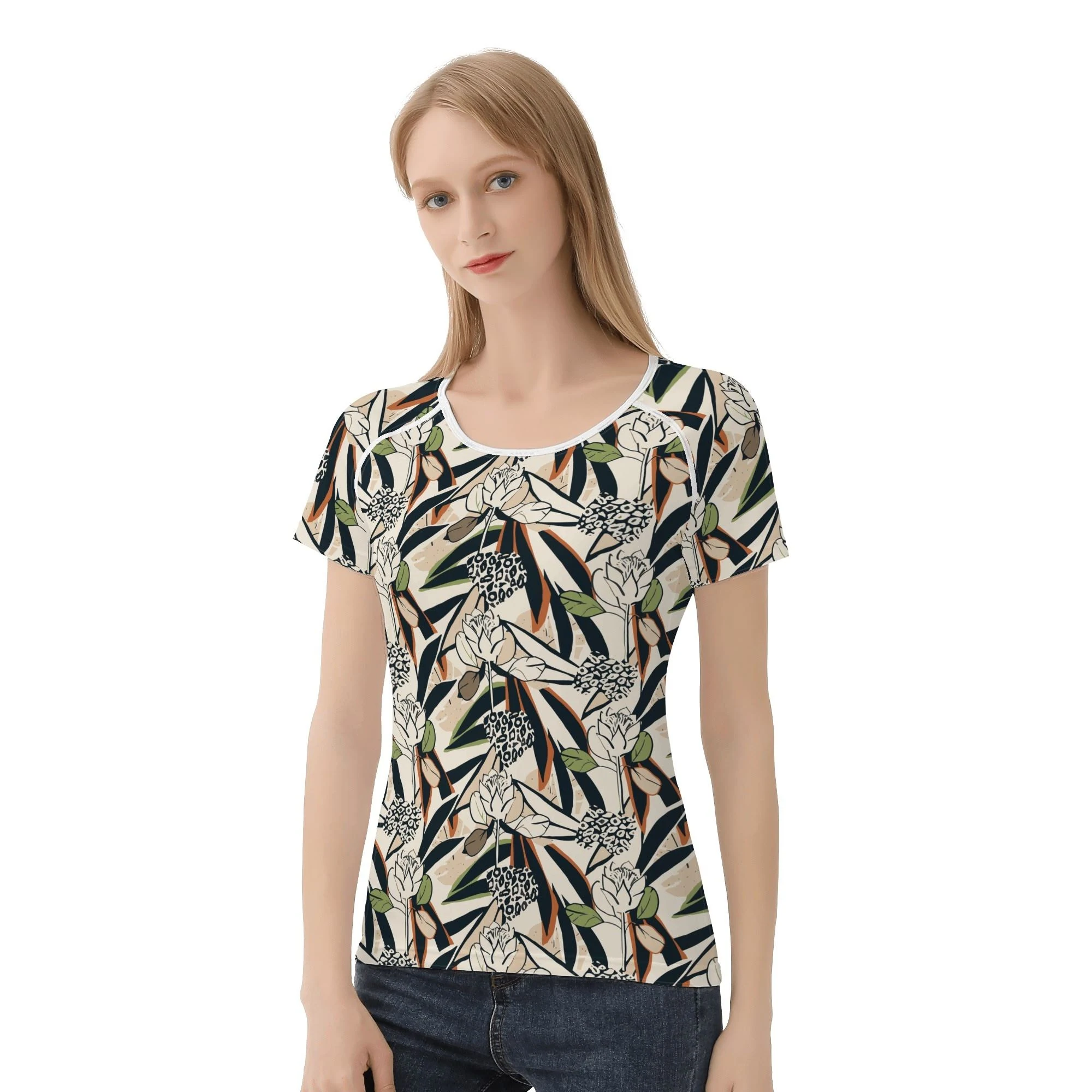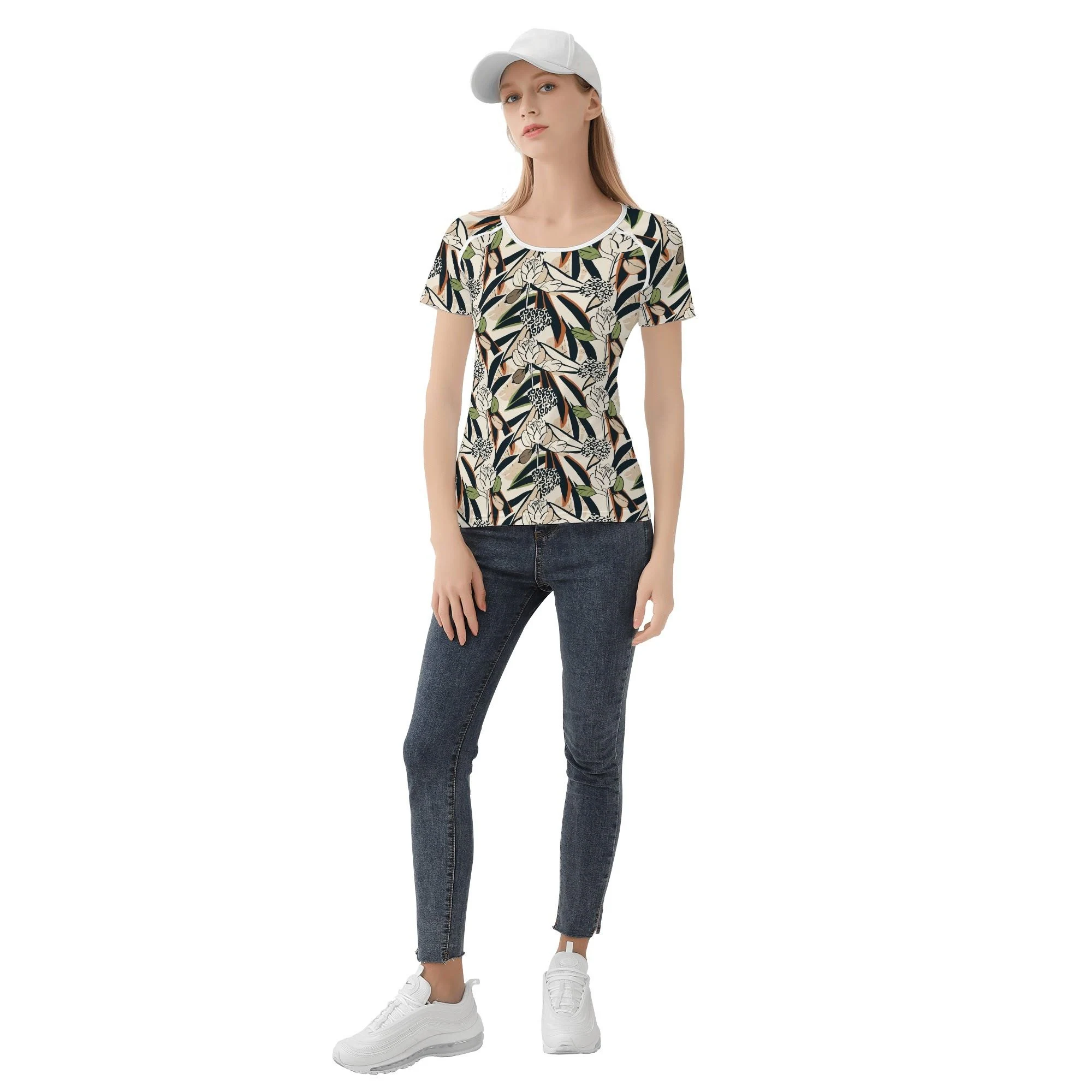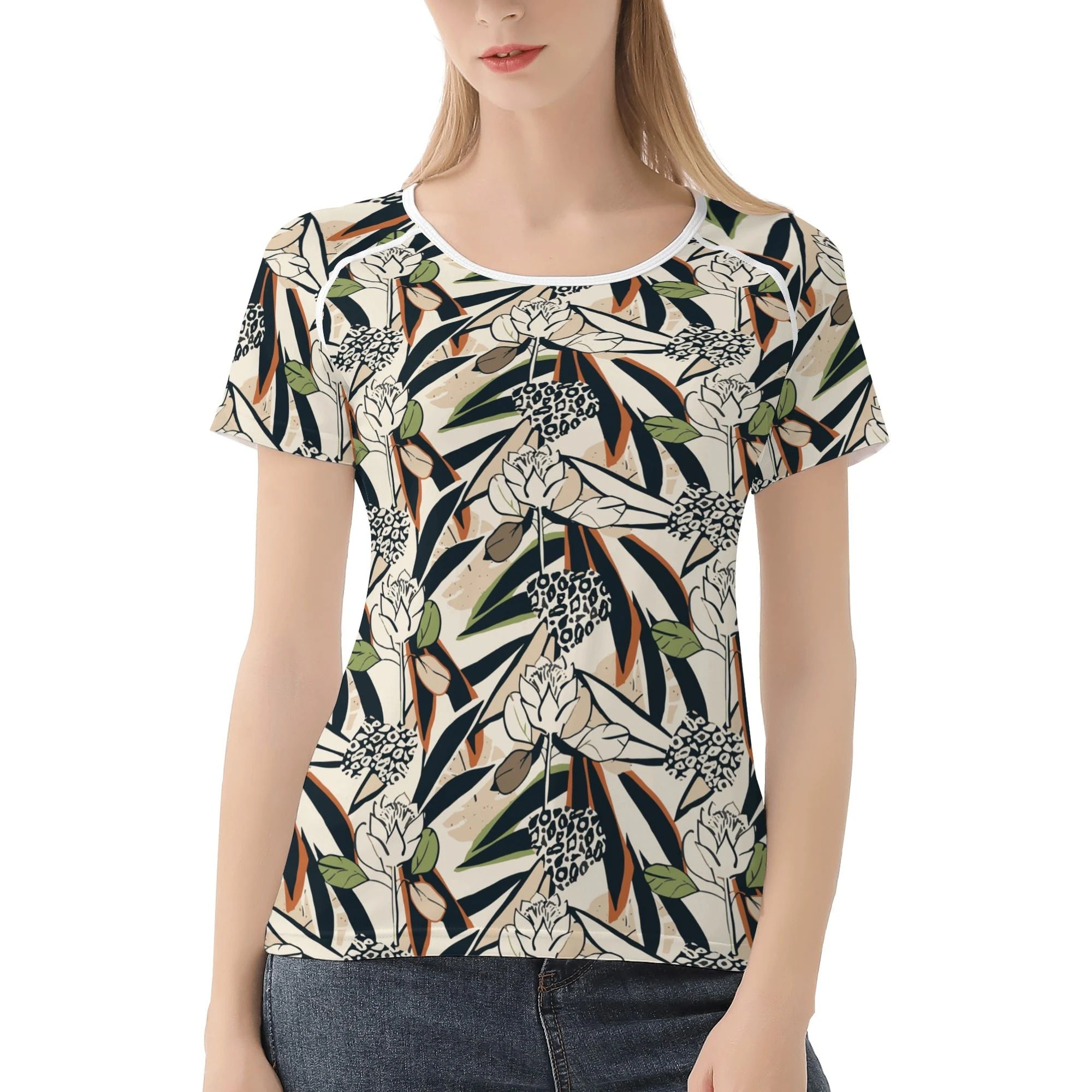 Esta camiseta no es la típica prenda con flores aburridas. No, aquí hablamos de un diseño que juega con las formas y los contrastes.