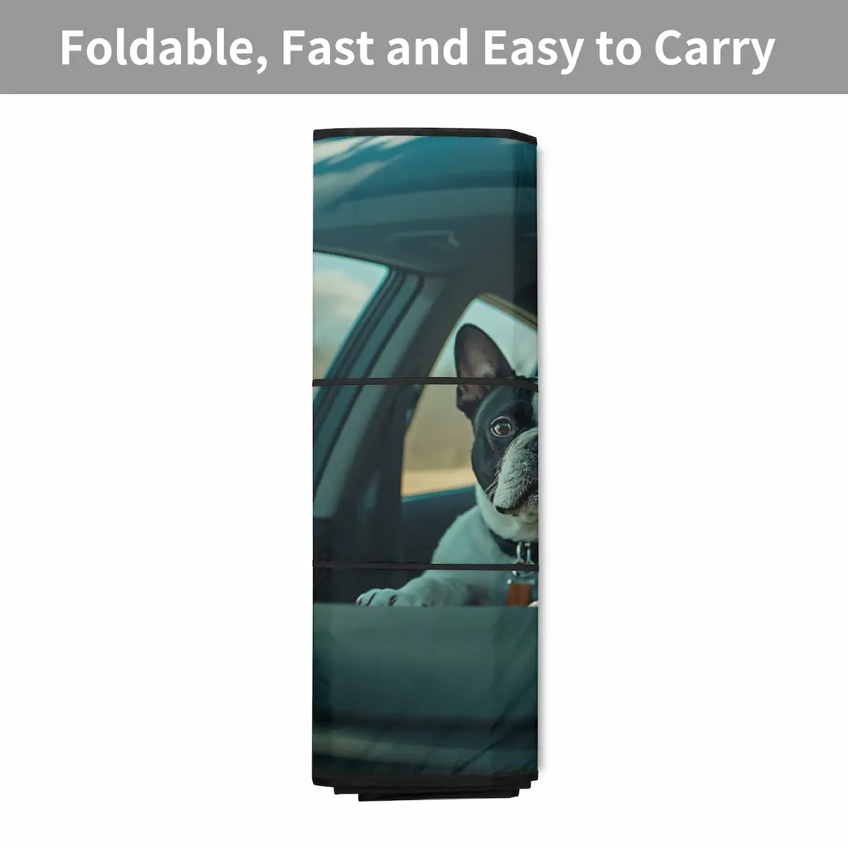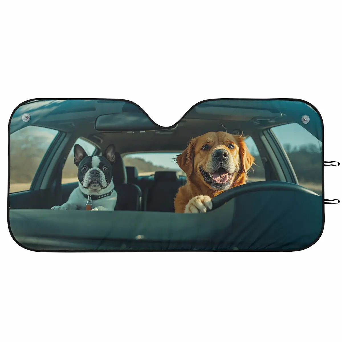 Inspirado en la vida real (y un poco en el caos diario de viajar con tus perros), este parasol captura el momento perfecto: el copiloto francés serio al volante y su copiloto dorado feliz disfrutando del viaje.