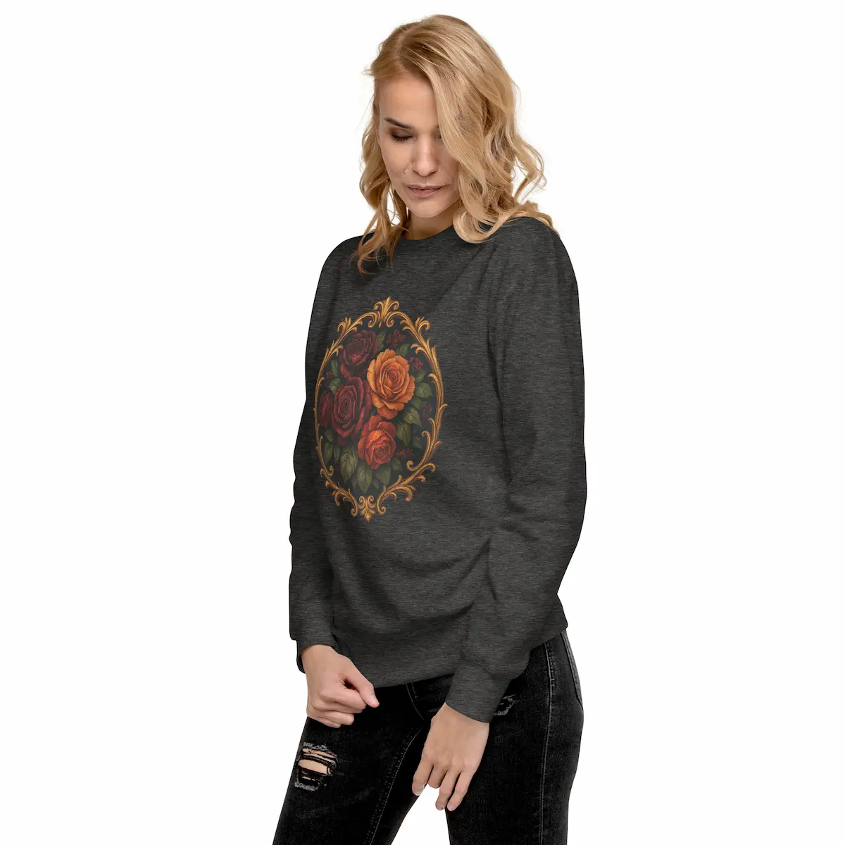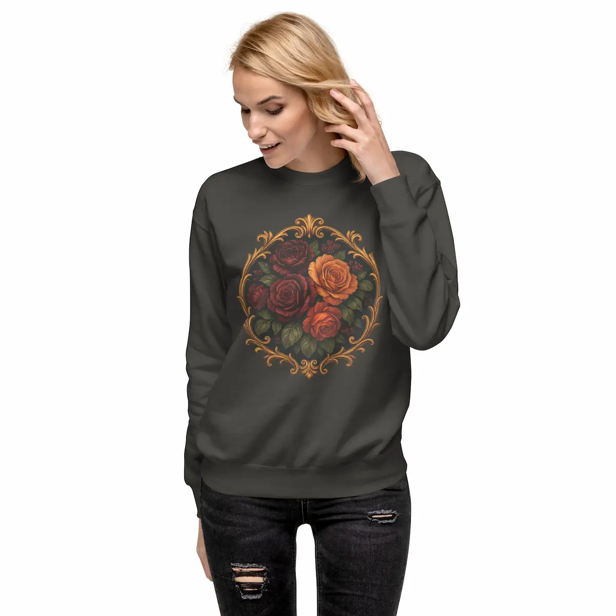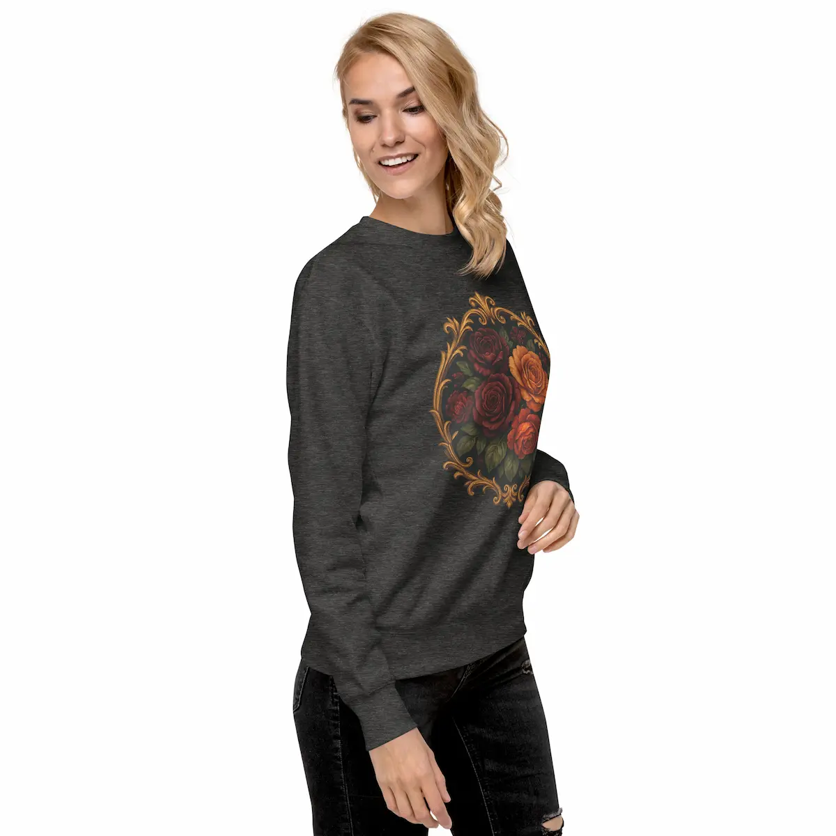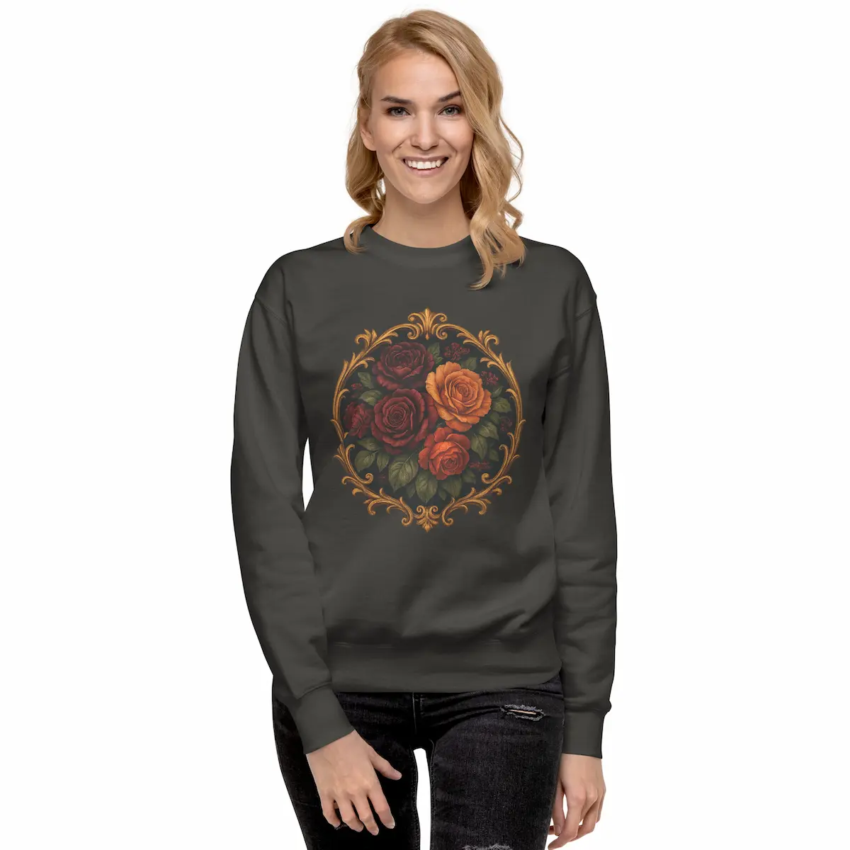 Midnight Bloom combina rosas oscuras y cálidas iluminadas como si estuvieran bajo luz dorada, rodeadas por un marco ornamental de inspiración barroca. Es romántica, nocturna y con un punto dramático. No es la típica sudadera con flores: es un statement visual, mezcla de melancolía y lujo clásico.