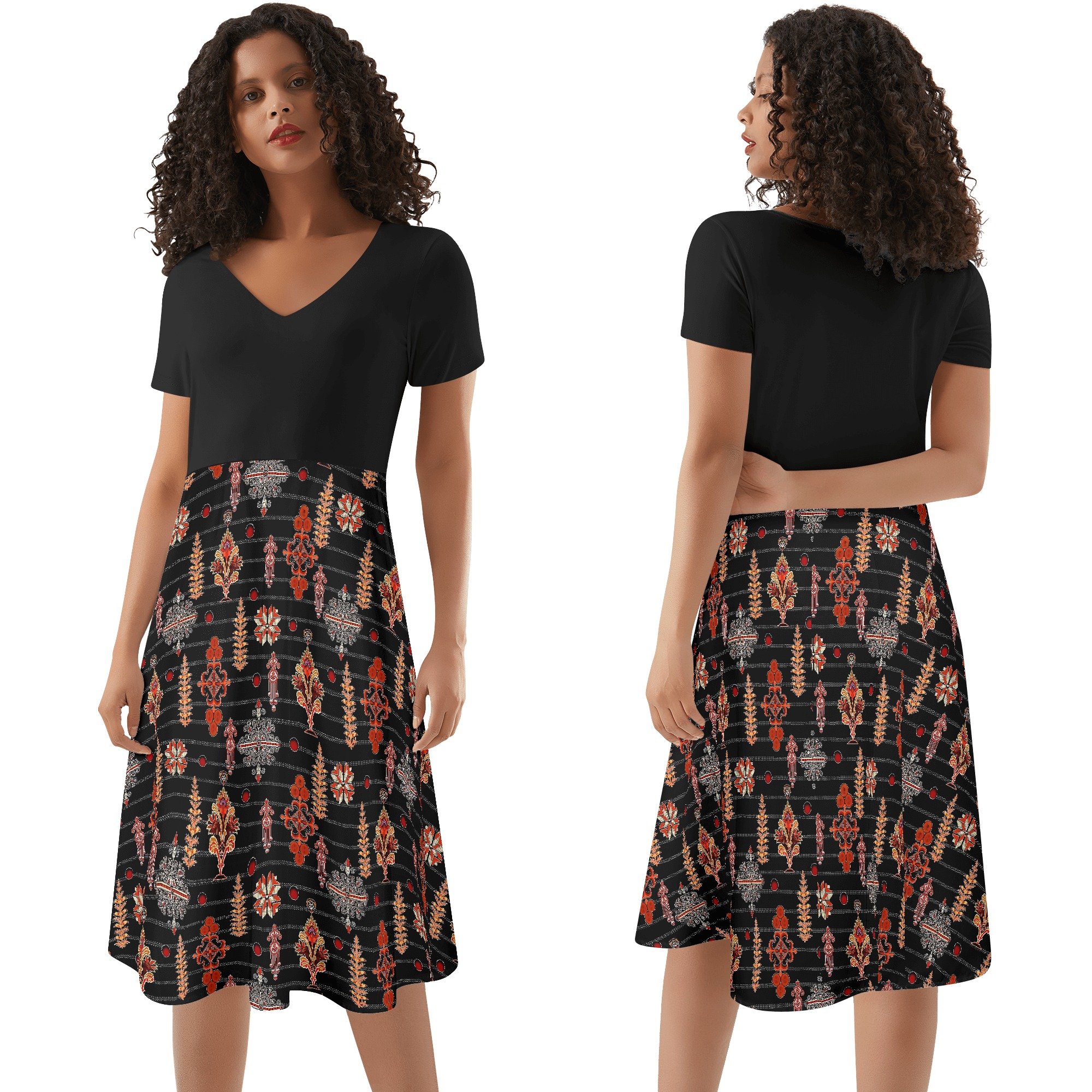 Lo primero que notarás en el Vestido Etnic Chic es su impresionante estampado. Su fondo negro potencia los tonos cálidos del diseño, donde las flores, las figuras geométricas y los pequeños detalles dorados crean una composición armónica y llamativa. Además, la simetría y repetición de los patrones aportan un aire sofisticado que lo convierte en una pieza de arte para vestir.