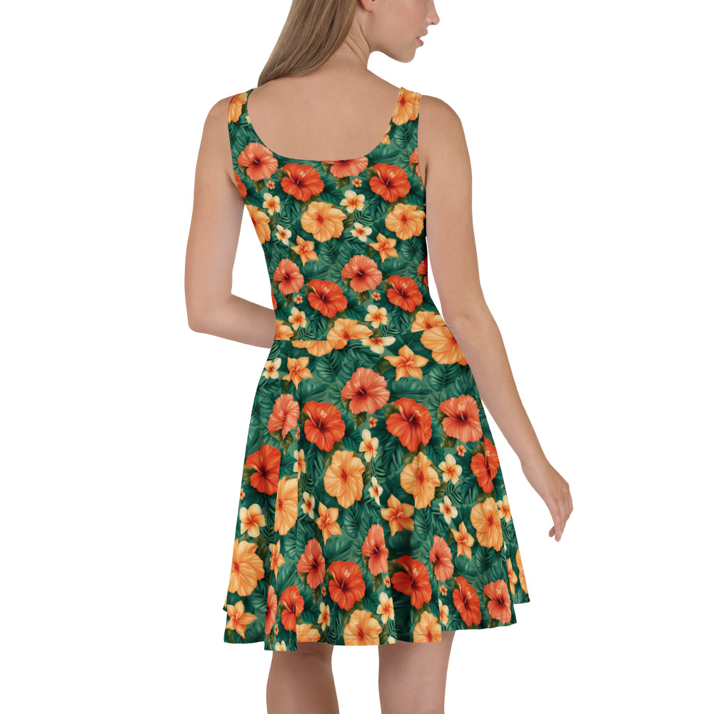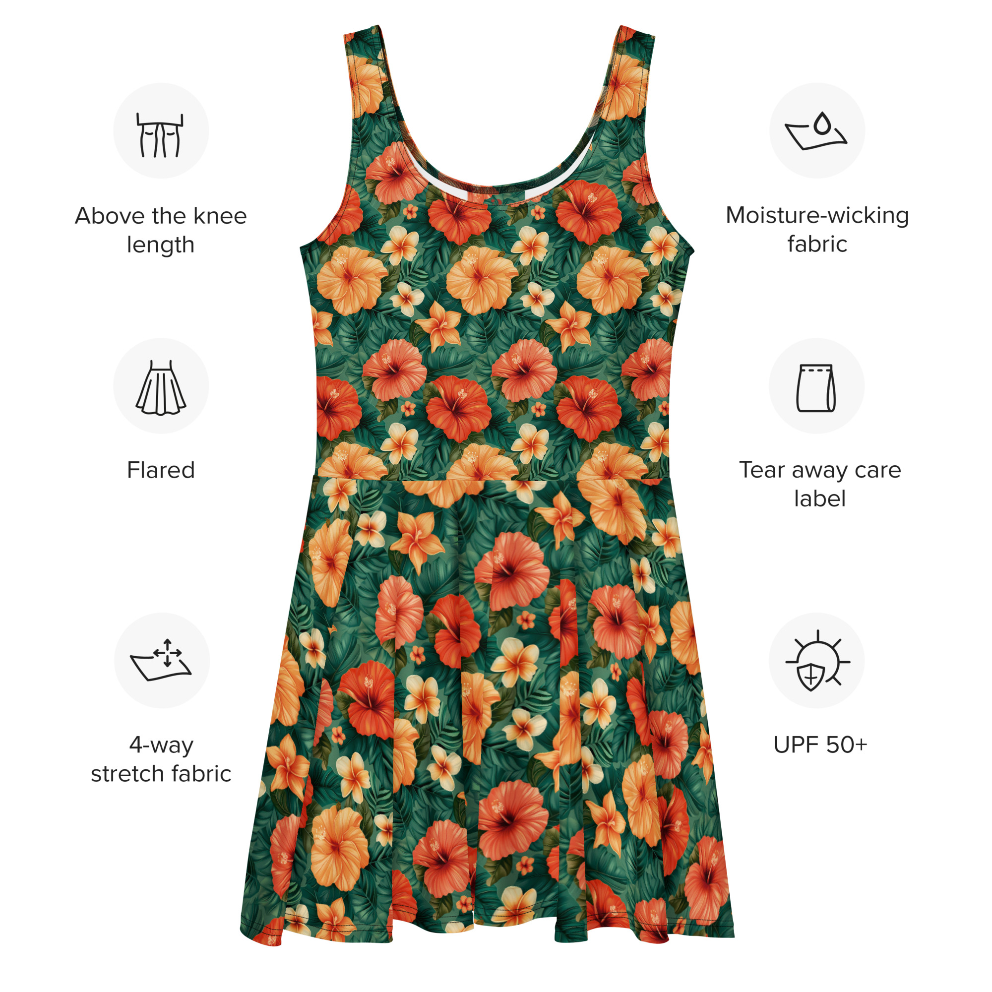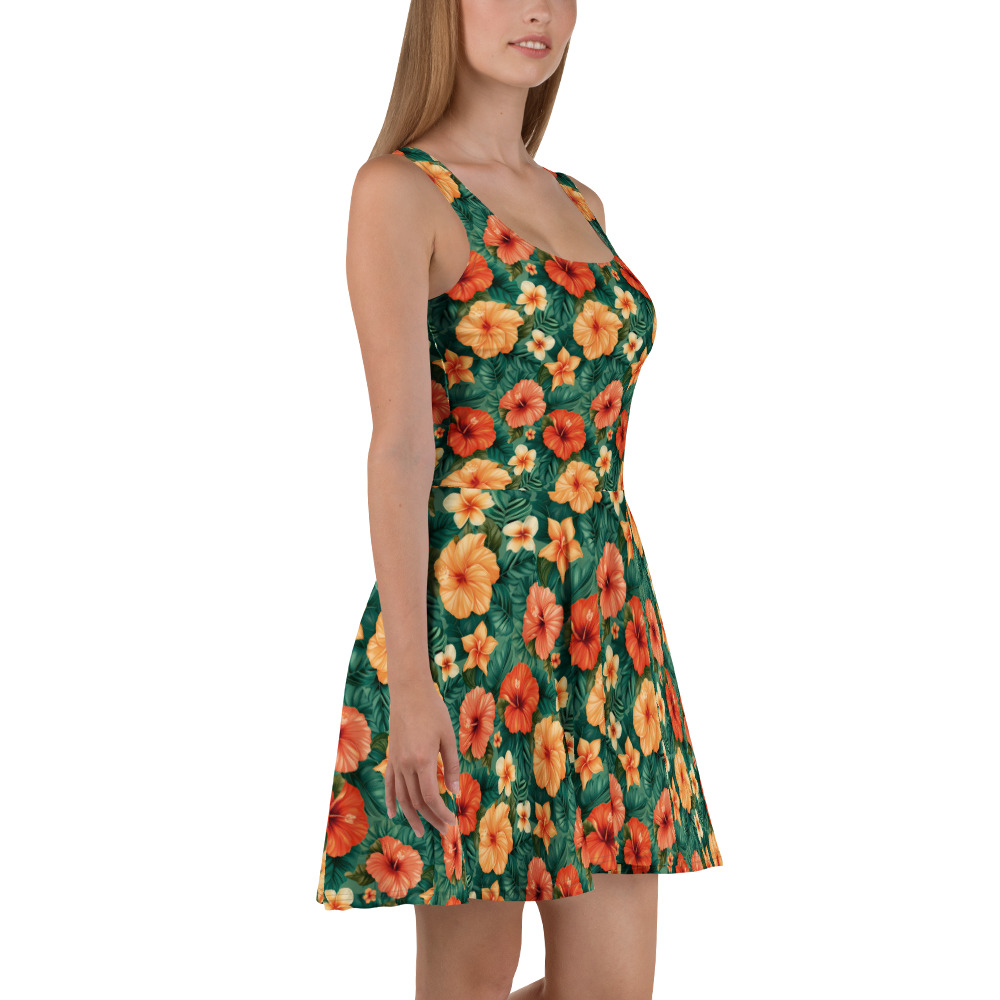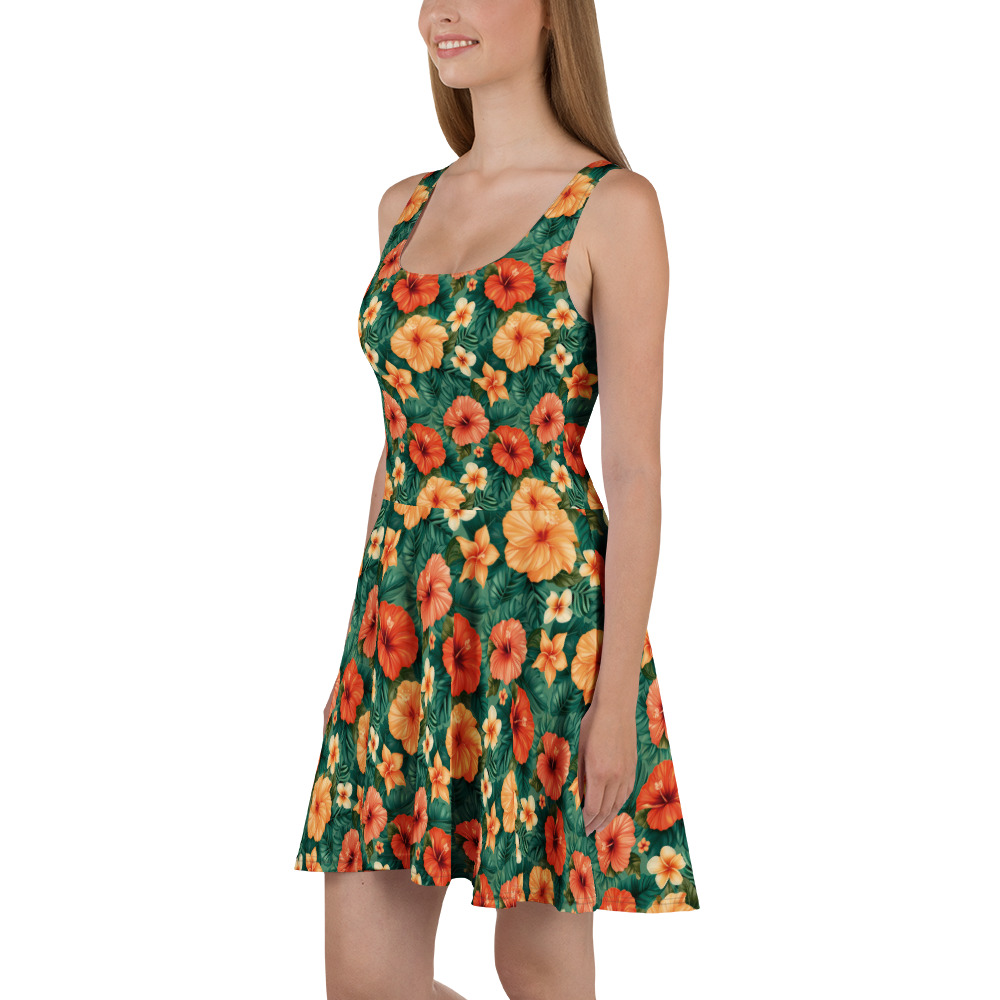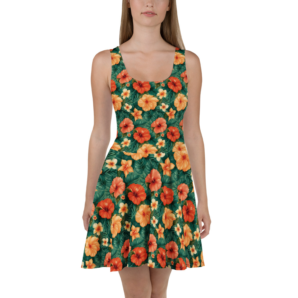 Mujer con vestido skater de flores hibisco rojas, naranjas y amarillas sobre fondo verde – colección Tropic – Heat.