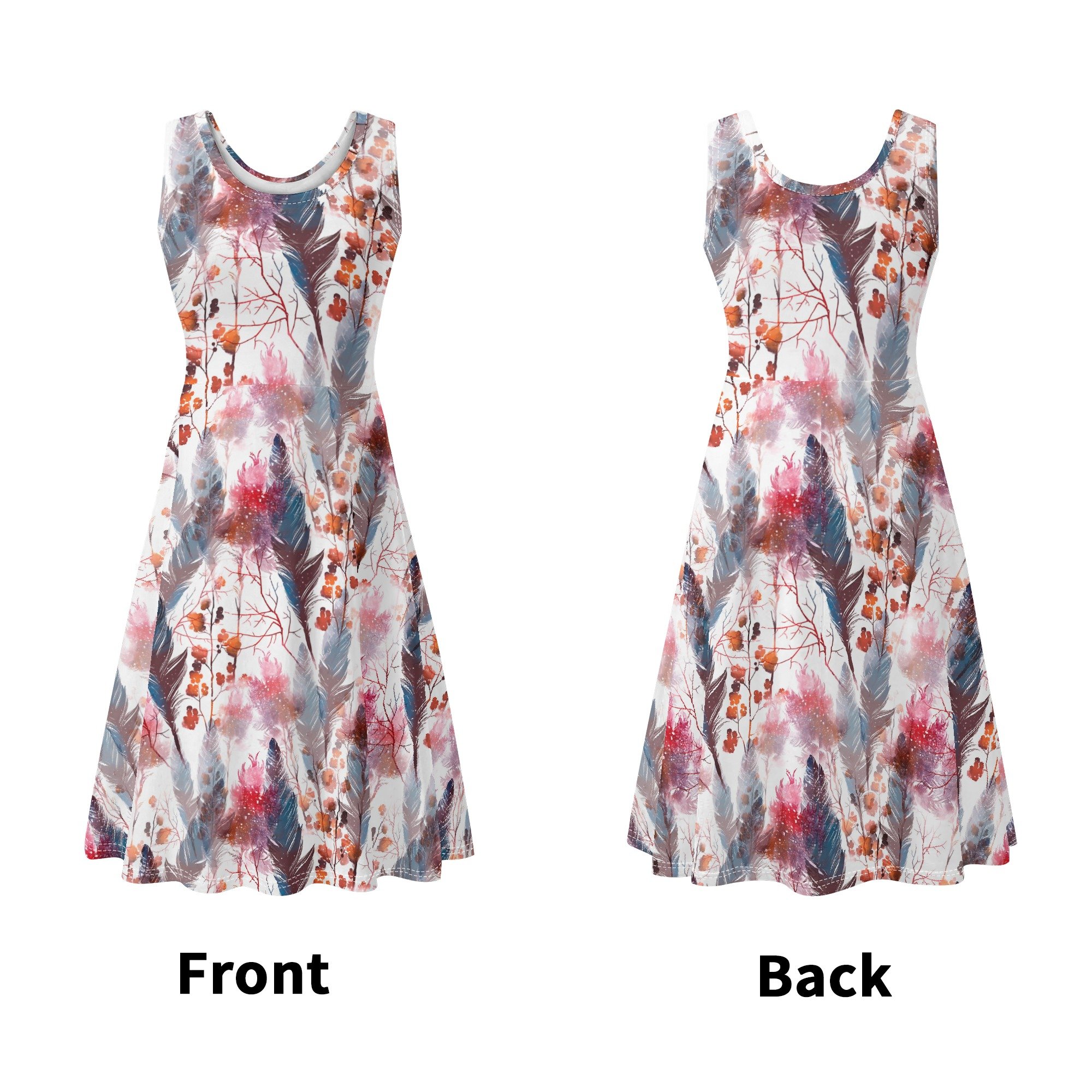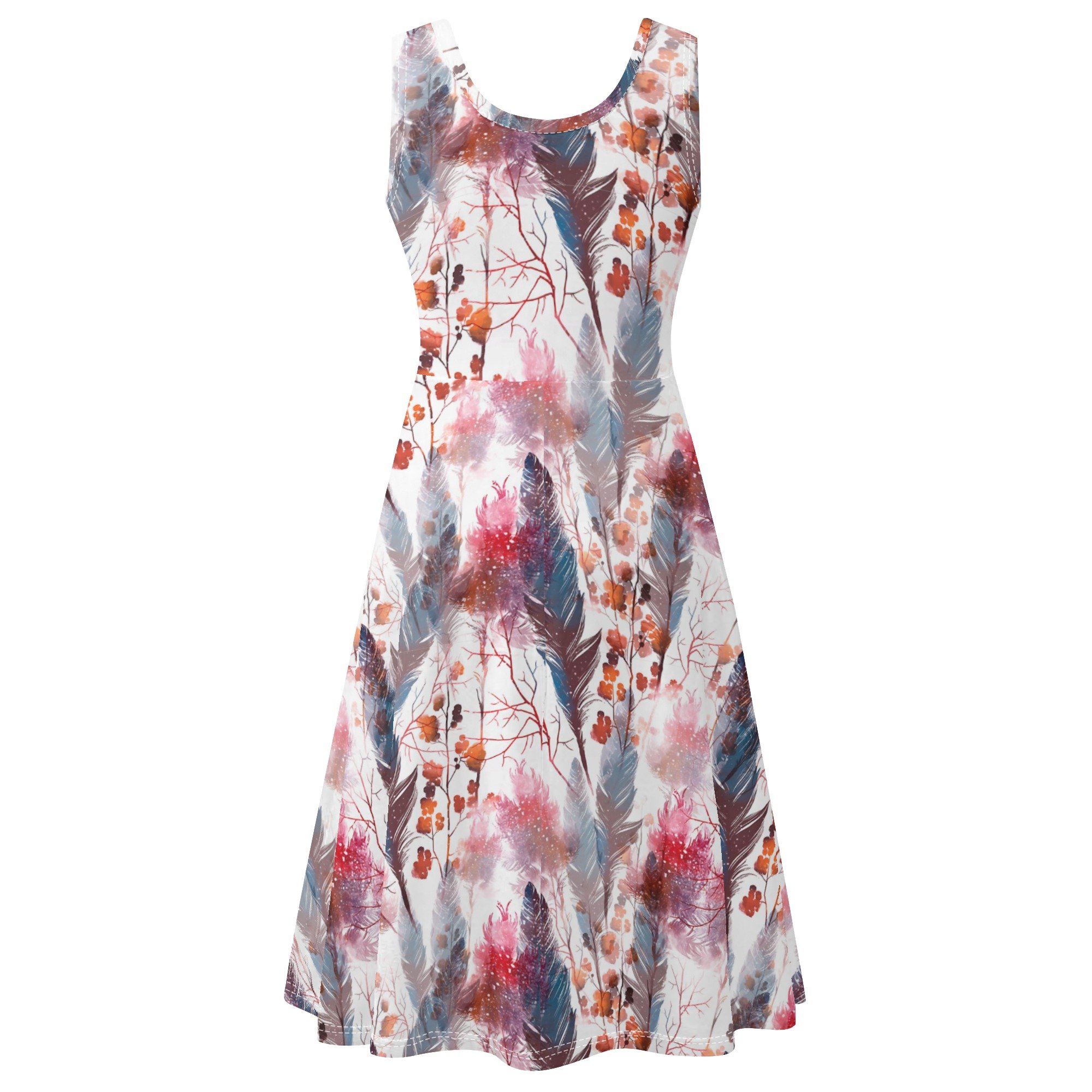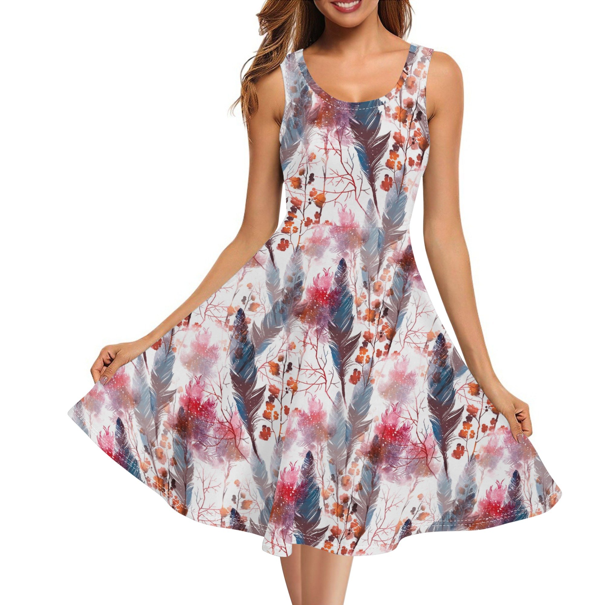 Lo que realmente distingue a este vestido es su exclusivo estampado boho chic. Imagina una obra de arte que combina plumas en tonos azulados y rojizos, ramas delgadas y hojas en tonos marrones y naranjas, todo sobre un fondo blanco que resalta los colores vibrantes. Este diseño no solo es visualmente atractivo, sino que también aporta una sensación de conexión con la naturaleza y un toque artístico a tu atuendo.